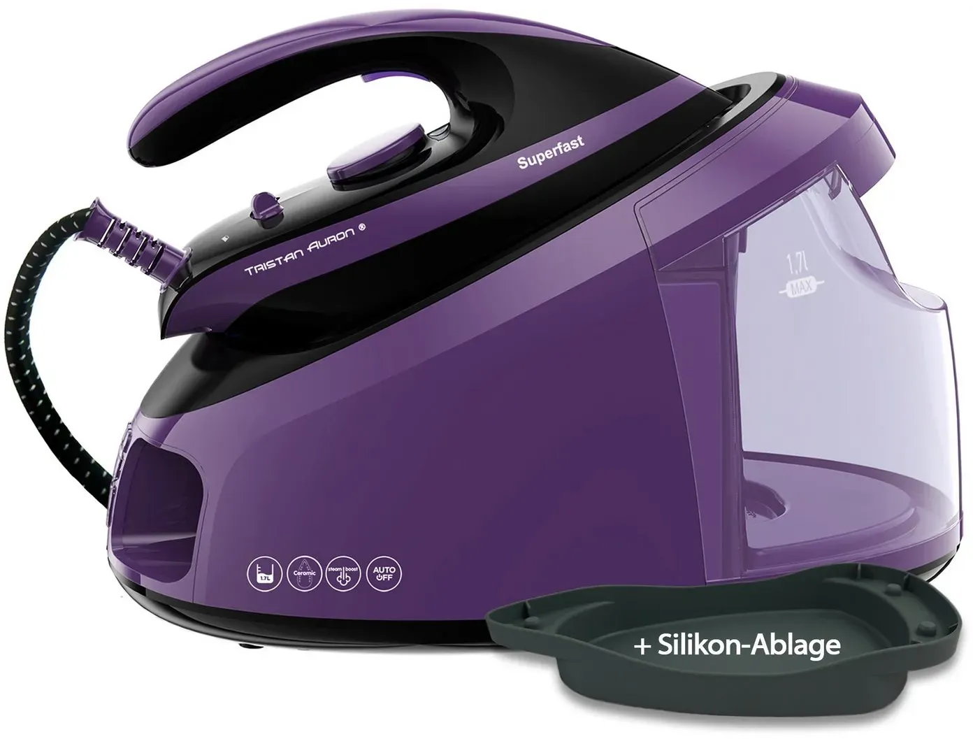 Verfügbarkeit: Auf Lager - Kategorie: Bügeleisen - Tristan Auron - GTIN:4260287213944 - 1. Maximale Dampfleistung €“ 8 bar Dampfdruck, 155 g/min Dauerdampf und 400 g/min Dampfstoß sorgen für müheloses Glätten selbst hartnäckiger Falten. 2. Schneller & effizienter bügeln €“ Das leichte Handstück und die hohe Dampfkraft sparen Zeit und machen das Bügeln angenehmer als mit herkömmlichen Bügeleisen. 3. Gleitet mühelos €“ Die hochwertige Keramiksohle ermöglicht sanftes, kratzfreies Bügeln. 1,8L Wassertank sorgt für lange Bügel-Sessions ohne ständiges Nachfüllen. 4. Perfekt für alle Stoffe €“ Wählen Sie aus 3 Dampfstufen und 4 Temperaturstufen (Seide, Wolle, Baumwolle, Max.), um empfindliche und robuste Stoffe optimal zu bügeln. 5. Sicher & praktisch €“ Automatische Abschaltung nach 10 Min. Inaktivität. Mit der Vertikaldampf-Funktion können Hemden, Kleider und Vorhänge einfach geglättet werden. 6. Einfache Reinigung & Entkalkung €“ Die Reinigungsanzeige erinnert an die Wartung. Die Entkalkungsfunktion entfernt Kalkablagerungen per Knopfdruck und verlängert die Lebensdauer. - 84,90 Euro bei Amazon Marketplace Kitchen - gefunden von billiger.de Diese Dampfbügelstation bietet eine hohe Leistung und einen großen Wassertank für effizientes Bügeln. ![]() ![]() Tristan Auron Dampfbügelstation Superfast Dampfbügelstation -6.5bar -2800W -420g/Min -1,7 L Wassertank, Sicherheitsabschaltung, Vertikales Bügeln, Entkalkungsfunktion lila