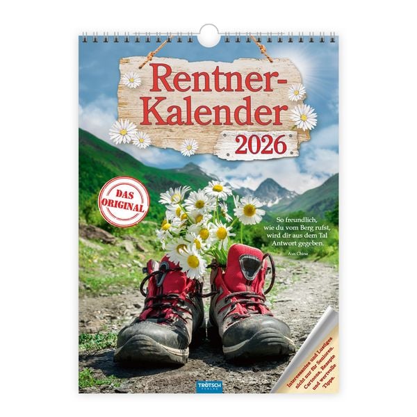 Trötsch Verlag - EAN: 9783988023865 - Der dekorative Rentnerkalender im Format 24 x 33 cm mit seinen herrlichen Fotos rückt den Ruhestand in den Fokus und wartet mit zusätzlichen, spannenden Informationen in jedem Monat auf. Dank gut ablesbaren Kalendariums, markierter Feiertage, Mondphasen und Platz für Notizen hilft der Kalender außerdem ganz wunderbar beim Organisieren des Alltags. Das perfekte Geschenk für alle Rentnerinnen und Rentner. - bei thalia.de - aus Yadore Produktdaten ![]() ![]() Trötsch Classickalender Rentnerkalender 2026