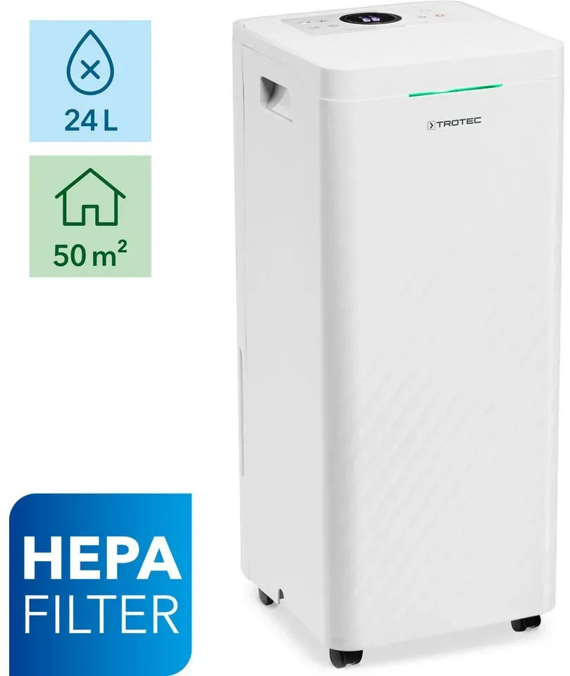Verfügbarkeit: Auf Lager - Kategorie: Luftentfeuchter - Trotec - GTIN:4052138109076 - 2in1Funktion: Kombinierte Luftentfeuchtung bis 12 l/Tag und Luftreinigung mit HEPAH13Filter reduziert Partikel wie Pollen und Staub Hygrostat-Automatik: Einstellbare Ziel-Luftfeuchtigkeit (3080 %) das Gerät reguliert Leistung und schaltet bei Erreichen automatisch ab Farb-LED zur Luftqualität: Ampelsystem (blau/grün/rot) visualisiert trockene, optimale oder hohe Luftfeuchtigkeit Komfortfunktionen: 24StdTimer, Nachtmodus, Wäschetrocknung & Auto-Restart für flexible Nutzung Voll ausgestattet: einfach zu reinigender Vorfilter, HEPAFilter, 2,5lWassertank, Schlauchanschluss für Dauerbetrieb, kompakt & leise - 164,99 Euro bei Amazon Marketplace Home Improvement - gefunden von billiger.de Der Trotec Luftentfeuchter und Luftreiniger TTK 64 HEPA bietet für 179.99 Euro eine 2-in-1-Lösung mit HEPA-Filter für größere Wohnräume und verbesserte Luftqualität. ![]() ![]() Trotec Luftentfeuchter und Luftreiniger TTK 64 HEPA Leistung 24 L/Tag Fläche 50 m2 / 125 m3 2in1 mit HEPA Filter