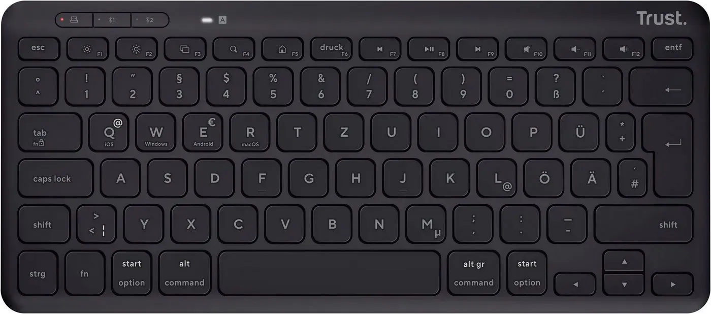 Zusammenfassung für Ihre Kaufentscheidung: | Merkmal | Details | |--------------------------|------------------------------------------------------------------------------------------| | Verbindung | Bluetooth, 2,4 GHz Funk (USB-Empfänger), USB | | Multi-Device | Bis zu 3 Geräte gleichzeitig, einfacher Wechsel | | Layout | QWERTZ (deutsch) | | Material | 85 % Recyclingkunststoff | | Akku | Wiederaufladbar, bis zu 12 Monate Laufzeit | | Kompatibilität | Windows, Mac OS, iOS, Android, Chrome OS | | Besonderheiten | Geräuscharme Tasten, Spritzwassergeschützt, Energiesparfunktion | | Größe/Gewicht | Kompakt, ca. 286 x 126 x 17 mm, 301 g | | Preis | Ca. 25-35 Euro, gelegentlich günstiger | | Nachteile | Kurzer Tastenhub, für große Hände evtl. zu klein, strenge Betätigungspunkte | Wenn Sie eine kompakte, vielseitige und preiswerte Bluetooth-Tastatur suchen, ist die Trust Lyra eine sehr gute Wahl. Achten Sie nur darauf, ob die kompakte Bauweise für Ihre Nutzung passt. Für den Kauf können Sie die Trust Lyra kompakte Bluetooth Tastatur direkt im Meta-Preisvergleich suchen und Preise vergleichen. Jetzt live Suche nach trust lyra kompakte bluetooth tastatur starten! Trust lyra kompakte bluetooth tastatur Angebote aus dem beliebtesten Preisbereich*Durch Käufe über Links zu Händlern kann diese Website eine Provision erhalten, u.a. durch das eBay Partner Network und das AmazonPartnerNet![]() ![]() Trust Lyra - Kompakte Bluetooth eBay Tastatur, QWERTZ-Layout, 85% Recyclingkunststoff