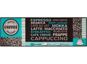 Teppiche Küchenmatten Möbel Räume Diele & Flur Teppiche und Läufer Teppichläufer Teppiche & Vorleger - EAN:4002398895639 - Dieser strapazierfähige Teppichläufer kombiniert Funktionalität mit modernem Design und ist die ideale Lösung für stark beanspruchte Bereiche wie Küche, Flur oder Eingangsbereich. Die hochwertige, flach gewebte Oberfläche ist besonders langlebig und schützt Ihren Bodenbelag zuverlässig vor alltäglicher Verschmutzung und Abnutzung. Dank der weichen Rückseite aus Baumwolle werden empfindliche Böden optimal geschont, während die geringe Gesamthöhe des Läufers Stolperfallen minimiert und die Verwendung auf Böden mit Fußbodenheizung ermöglicht. Zur Sicherung der Rutschfestigkeit auf glatten Untergründen empfehlen wir die Kombination mit einer passenden Antirutsch-Unterlage. Die pflegeleichte Qualität sorgt für eine mühelose Reinigung im Alltag und rt dauerhafte Hygiene. Mit seiner zeitlosen Optik fügt sich der Läufer harmonisch in jedes Wohnambiente ein und bietet eine praktische sowie stilvolle Aufwertung für Ihr Zuhause., Maßangaben: Breite: 50 cm, Länge: 150 cm, Höhe: 4 mm, Konfektion: Fixmaß, Gewicht: 1,1, Farbe & Material: Farbbezeichnung: türkis, Material: Polyamid, Rückenmaterial: Polyamid, Optik/Stil: Design: mit Motiv, Motiv: Kaffee, Abschluss der Teppichkante: gekettelt, Ausstattung & Funktionen: Fußbodenheizungsgeeignet: ja, Outdoorgeeignet: nein, Rutschhemmend beschichtet: nein, Rutschhemmende Unterlage empfohlen: ja, Pflegehinweis: ... ![]() Küchenläufer ANDIAMO 'Cafe Creme' Gr. 11, blau (türkis), B:50cm H:4mm L:150cm, Polyamid, Teppiche, Motiv Kaffee, mit Schriftzug, Größe 50x150 cm, Küche