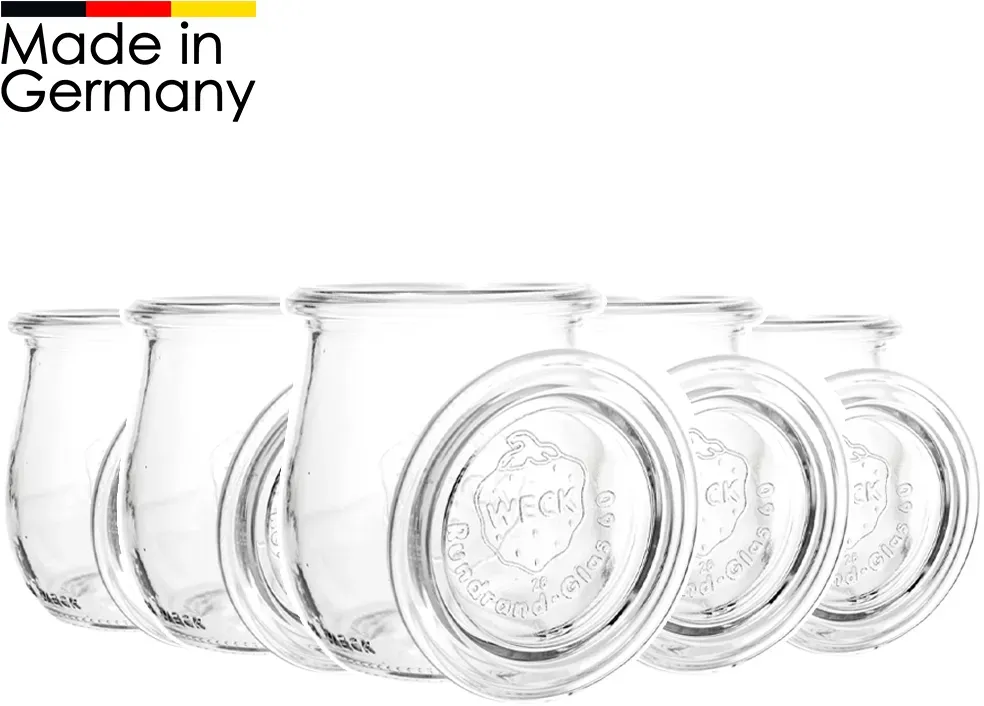 Kategorie: Vorratsgläser - Weck - Das kleine 220ml WECK Tulpenglas ist ein Einmachglas mit einer bauchigen Form und hat einem Mündungsdurchmesser von nur 60mm. Durch diese ästhetische Form lassen sich Lebensmittel nicht nur optisch schön einwecken, sondern das Glas eignet sich auch für das Anrichten und Dekorationen. Unser kleines 220ml WECK Tulpenglas besteht aus dickem und stabilem Glas und wird in Deutschland hergestellt. Eigenschaften des kleinen WECK Tulpenglas - dekoratives DessertglasAuch das kleine WECK Tulpenglas bringt die besten Eigenschaften für das Einwecken mit und bietet dazu noch viele weitere Verwendungsmöglichkeiten einwecken von Kompott, Pudding oder Dipszum Dekorieren in der Küche oder im Haushalt als KerzenglasSpülmaschinen geeignetDeckel sind nur durch das Einkochen auslaufsicherdass 220ml WECK Tulpenglas und die Glasdeckel sind für die Heißabfüllung geeignet Zubehör und Verschlussformen für das kleine WECK Tulpenglas mit 220ml Das WECK Tulpenglas kann mit dem Glasdeckel und den Dichtringen sicher eingekocht werden. Die Dichtringe gibt es in rot. Diese sind für das Pasteurisieren bis 98 C und Sterilisieren bis 121 C geeignet. Auch das einwecken von ölhaltigen Lebensmitteln ist mit diesen Gläsern und Dichtung möglich. Für das Einkochen muss der Glasdeckel mit den praktischen WECK Klammern aus rostfreiem Edelstahl sicher fixiert werden. Unsere Empfehlung ist, pro Glas mindestens 2 Klammern zu verwenden. Nach dem einkochen und auskühlen, können diese vom ... Dieses 5er-Set ist eine gute Option für kleinere Haushalte oder wenn nur eine geringe Menge an Gläsern benötigt wird. ![]() ![]() 5er Set WECK-Mini-Tulpenglas 220 ml - Weckgläser - Weckglas mit oder ohne Deckel