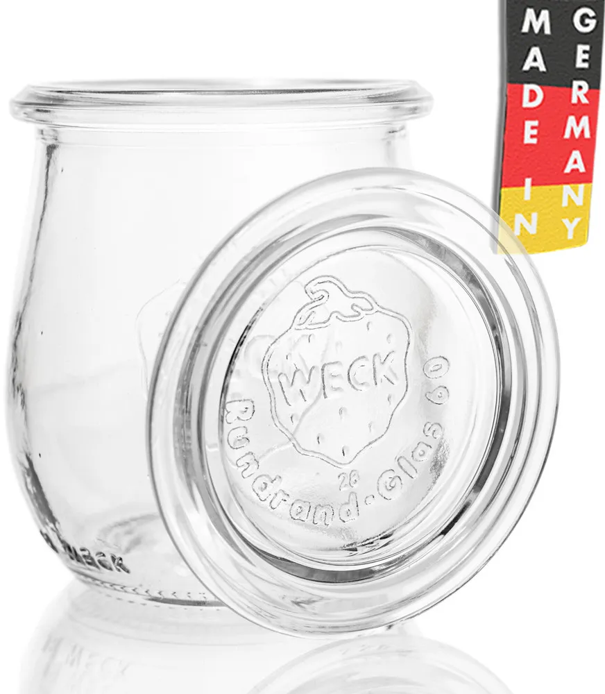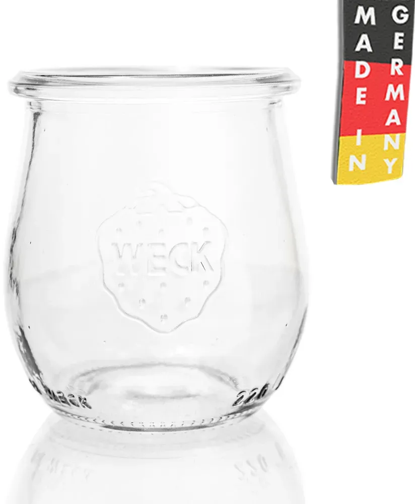 Kategorie: Vorratsgläser - Weck - Das kleine 220ml WECK Tulpenglas ist ein Einmachglas mit einer bauchigen Form und hat einem Mündungsdurchmesser von nur 60mm. Durch diese ästhetische Form lassen sich Lebensmittel nicht nur optisch schön einwecken, sondern das Glas eignet sich auch für das Anrichten und Dekorationen. Unser kleines 220ml WECK Tulpenglas besteht aus dickem und stabilem Glas und wird in Deutschland hergestellt. Eigenschaften des kleinen WECK Tulpenglas - dekoratives DessertglasAuch das kleine WECK Tulpenglas bringt die besten Eigenschaften für das Einwecken mit und bietet dazu noch viele weitere Verwendungsmöglichkeiten einwecken von Kompott, Pudding oder Dipszum Dekorieren in der Küche oder im Haushalt als KerzenglasSpülmaschinen geeignetDeckel sind nur durch das Einkochen auslaufsicherdass 220ml WECK Tulpenglas und die Glasdeckel sind für die Heißabfüllung geeignet Zubehör und Verschlussformen für das kleine WECK Tulpenglas mit 220ml Das WECK Tulpenglas kann mit dem Glasdeckel und den Dichtringen sicher eingekocht werden. Die Dichtringe gibt es in rot. Diese sind für das Pasteurisieren bis 98 C und Sterilisieren bis 121 C geeignet. Auch das einwecken von ölhaltigen Lebensmitteln ist mit diesen Gläsern und Dichtung möglich. Für das Einkochen muss der Glasdeckel mit den praktischen WECK Klammern aus rostfreiem Edelstahl sicher fixiert werden. Unsere Empfehlung ist, pro Glas mindestens 2 Klammern zu verwenden. Nach dem einkochen und auskühlen, können diese vom ... Dieses Einzelglas mit Glasdeckel ist perfekt, um ein einzelnes Glas zu ersetzen oder die Sammlung zu ergänzen. ![]() ![]() WECK-Tulpenglas 220 ml RR60 mit Glasdeckel - Weckgläser - Weckglas mit oder ohne Deckel