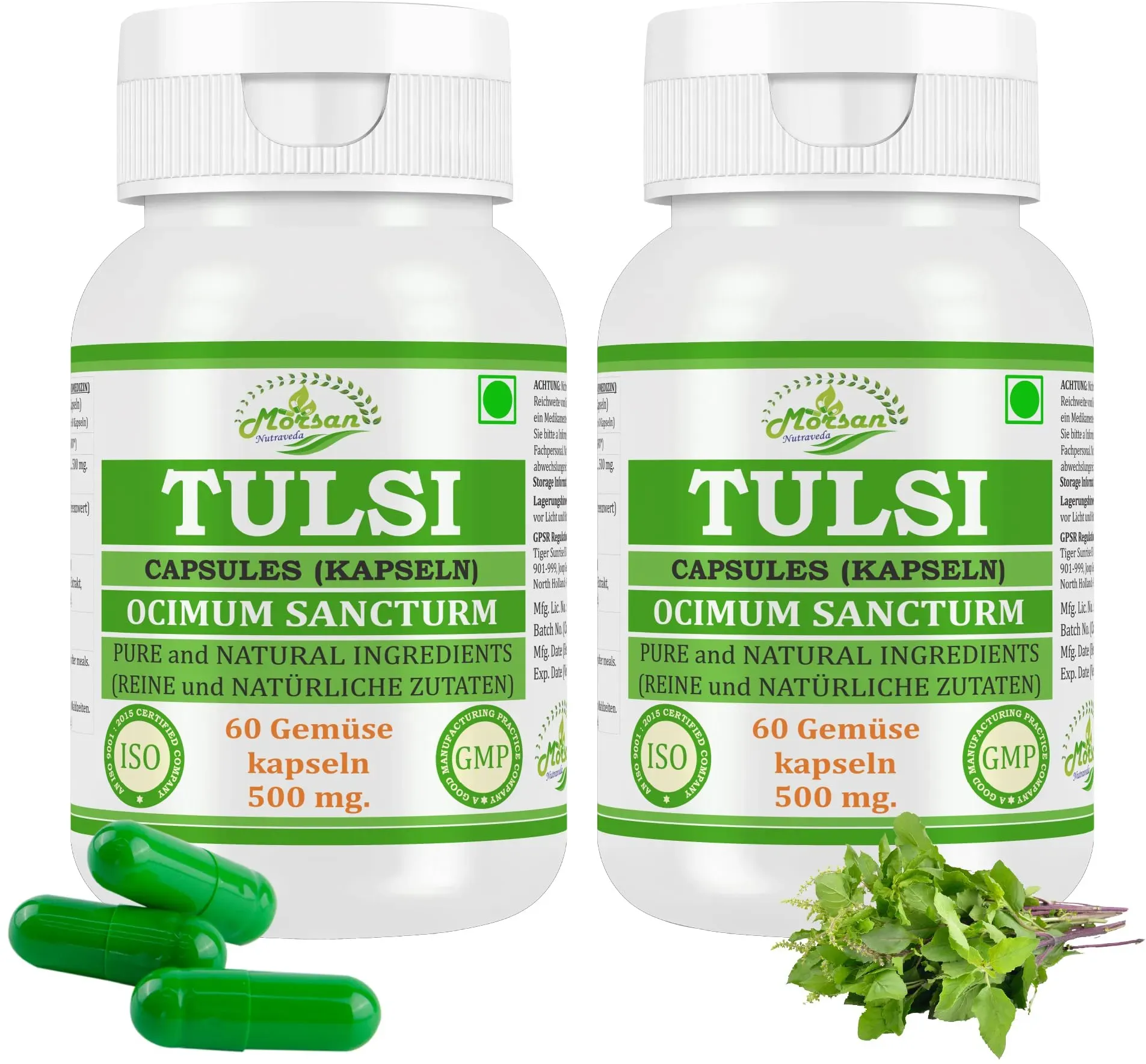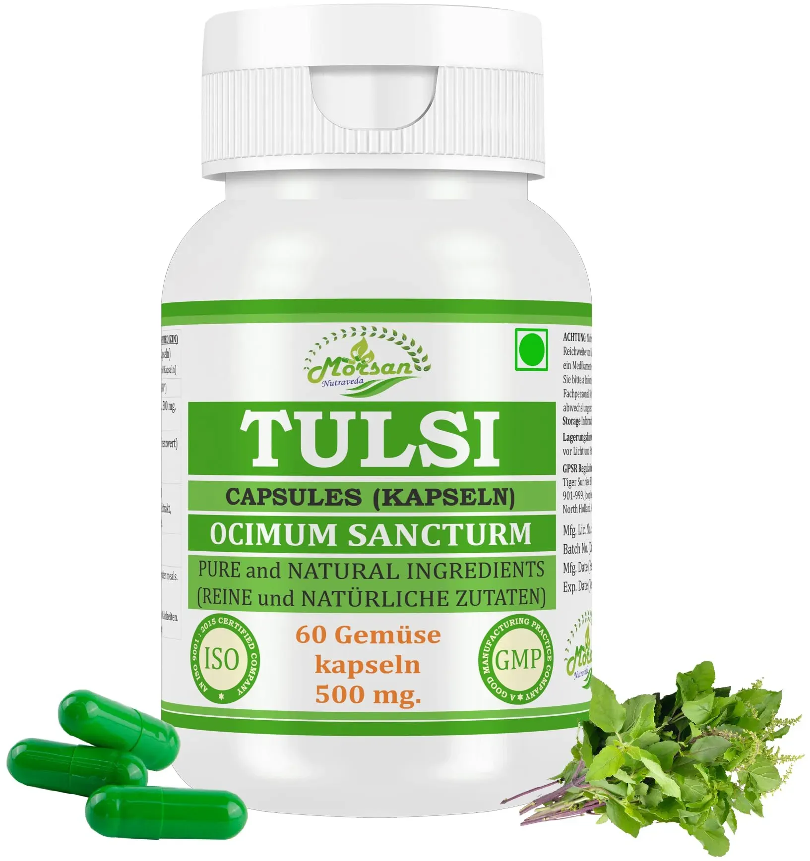 Kategorie: Nahrungsergänzungsmittel - morsan nutraveda - TULSI-EXTRAKT EIN HEILIGES KRAUT FüR GANZHEITLICHES WOHLBEFINDEN: Morsan Nutraveda Tulsi (Ocimum Sanctum)-Kapseln werden mit einem wirksamen 10:1-Konzentratextrakt hergestellt und liefern das äquivalent von 5.000 mg rohem Tulsi pro 500-mg-Kapsel. Tulsi, auch als Heiliges Basilikum bekannt, wird im Ayurveda seit Jahrhunderten für seine adaptogenen und traditionellen Wellness-Eigenschaften verehrt. Jetzt können Sie dieses heilige Kraut bequem in Ihre tägliche Routine integrieren. REINE UND PREMIUM-FORMULIERUNG: Unsere Tulsi-Kapseln enthalten hochwertigen Ocimum Sanctum-Extrakt, der sorgfältig verarbeitet wird, um seine natürlichen wohltuenden Verbindungen zu erhalten. Dieses Nahrungsergänzungsmittel ist frei von künstlichen Zusatzstoffen, Füllstoffen und synthetischen Inhaltsstoffen und gewährleistet maximale Reinheit und Wirksamkeit. EINFACH ZU VERWENDENDE VEGETARISCHE KAPSELN: Jede Flasche enthält 60 vegetarische Kapseln, die für eine mühelose tägliche Nahrungsergänzung konzipiert sind. Die leicht zu schluckenden pflanzlichen Kapseln bieten eine einfache Möglichkeit, Tulsi in Ihr Wellnessprogramm zu integrieren. SAUBERE, SICHERE UND NATüRLICHE ZUTATEN: Die Tulsi-Kapseln von Morsan Nutraveda sind gentechnikfrei, glutenfrei und frei von Zucker, Milchprodukten, Hefe, Weizen, Baumnüssen und künstlichen Konservierungsstoffen. Jede Charge wird strengen internen Qualitätstests unterzogen, um Reinheit und Wirksamkeit ... Dieses Produkt bietet einen hohen Extraktanteil und ist für eine 90-Tage-Versorgung ausgelegt, was es zu einer effizienten Wahl macht. ![]() ![]() Tulsi Heiliges Basilikum 500 mg - Extrakt mit 5% Ursolsäure - 90 Vegane Kapseln - 90 Tage Vorrat - Unterstützung der Stressresilienz - von Apollo's Hegemony