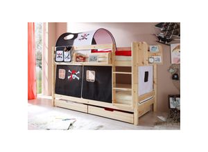 Betten & Kopfteilbezüge Möbel Betten Kinderbetten Hochbetten Schlafzimmermöbel - EAN:5420070240895 - Das halbhohe Bett aus der Serie Scott, mit Rutsche und einer Liegefläche von 90 x 200 cm, ist ideal zum Spielen und Schlafen. Ein Abenteuerspielplatz im Kinderzimmer. Der Artikel ist aus massiver Kiefer gefertigt und die Oberfläche ist weiß lackiert. Das Textilset besteht aus dem Vorhang und dem Tunnel. Der vordere Vorhang hat einen Durchlass, der hochgerollt werden kann. Die Textilien sind 100% Baumwolle, bei 30° waschbar. Ein Rolllattenrost mit 15 Leisten (ca. B: 70 x H: 1,7 mm) ist bereits im Lieferumfang enthalten. Der Absturzschutz gibt zusätzlich Sicherheit und ist vorne in Sprossenoptik, nach hinten besteht er aus zwei Paneelen. Der Abstand vom Boden bis Oberkante Absturzschutz sind 114 cm, die Einstiegshöhe bis Oberkante Bettseite ist ca. 81,5 cm und die Höhe von der Oberkante der Bettseite bis Oberkante Absturzschutz ca. 32 cm. Das Kopf- und Fußteil hat ein geschlossenes Paneel, außen mit einer gefrästen Ornamentik. Nach innen hin ist das Paneel glatt. Besonders ist der Leiterturm, mit der Rutsche. Aus platzsparenden Gründen verläuft die Rutsche wie abgebildet im 33° Winkel zum Bett. Sie kann nach rechts oder links verlaufen, indem die Teile des Absturzschutzes spiegelverkehrt montiert werden. Die ca. 35 cm breiten Trittstufen sorgen für sicheres Hinauf- und Hinabsteigen. Zusätzlich hat die Leiter Grifflöcher, an denen man sich prima festhalten kann. Der Raum unter ... Dieses Natur24 Kinderbett Etagenbett Sky ist eine Premium-Option aus massiver Buche, die Langlebigkeit und ein stilvolles Design verspricht. ![]() ![]() Natur24 Kinderbett Etagenbett Sky Buche massiv Weiß lackiert mit Tunnel Bett weiß