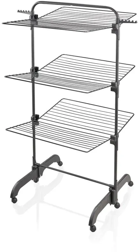 Kategorie: Wäscheständer - MetroDecor - GTIN:0192173085585 - VIEL HäNGEPLATZ: Der Turmwäschetrockner bietet mit seinem 3-Ebenen-System viel Platz, um T-Shirts, Sweatshirts, Hosen, Unterwäsche, Socken und vieles mehr Lufttrocknen zu lassen. CLEVERES DESIGN: Der Wäschetrockner ist faltbar und versperrt somit nicht viel Platz, wenn er nicht in Gebrauch ist. Er ist leichtgewichtig und lässt sich einfach auseinanderziehen. ENERGIE SPAREN: Der Trockenständer ist nicht nur praktisch, er spart auch noch Energie und ist umweltfreundlich! Er kann innerhalb des Hauses sowie im Freien genutzt werden. LANGLEBIGES MATERIAL: Der Kleiderständer ist aus nachhaltigem und robustem Bambus gefertigt. KOMPAKTE MAßE: Mit den Maßen von 67,1 cm x 35,6 cm x 110,0 cm bietet der Turmwäscheständer ausreichend Platz zur Trocknung von allerlei Wäsche und lässt sich sehr platzsparend zusammenfalten. - 42,99 Euro bei Amazon Marketplace Kitchen - gefunden von billiger.de Der Leifheit Turmtrockner Classic Tower 270 Black Edition ist mit 44.95 Euro eine kompakte und bewährte Lösung für kleinere Wäschemengen. ![]() ![]() Leifheit Turmtrockner Classic Tower 270 Black Edition mit Rollen, 27m Leinenlänge für 2-3 Wäscheladungen, platzsparender Wäscheturm, halbseitig abklappbarer Turmwäscheständer für die Dusche, schwarz