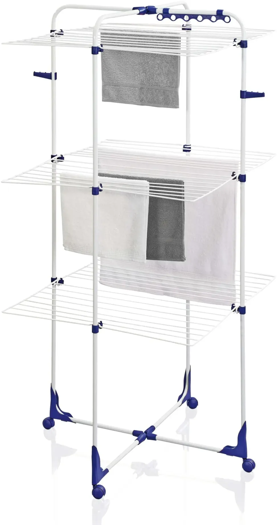 Kategorie: Wäscheständer - Leifheit - GTIN:4006501814357 - Die Dusche als Trockenplatz - der Turmtrockner Pegasus Tower 190 macht es möglich. Mit seiner Standfläche von nur 66 cm x 61 cm passt er exakt in eine Duschkabine. Oder auf einen sehr kleinen Balkon. Drei übereinander liegende Trockenebenen bieten eine Trockenlänge von 19 Metern. Für längere Wäschestücke lässt sich die mittlere Ebene abklappen. Die Höhe beträgt 1,5 Meter. - 52,99 Euro bei OBI - gefunden von billiger.de Dieser TODECO Wäschesständer Turm Klappbar mit 3 Ebenen und Rollen ist mit 57.99 Euro eine flexible und mobile Lösung. Manomano.d e