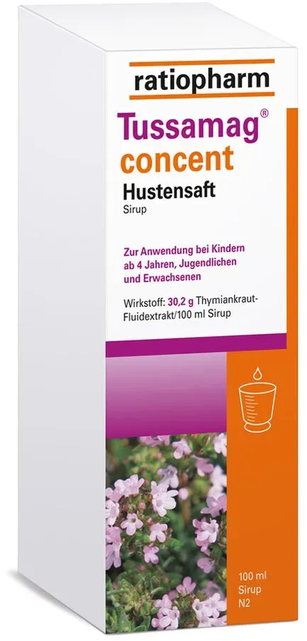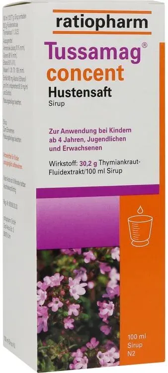 4.27 - Husten & Erkältung Erkältung & Schmerzen Mittel gegen Husten Hustenstiller Medizin & Heilmittel - Anwendungsgebiet von Tussamag Concent Hustensaft 30,2 G/100 Ml SirupNatürlich und stark gegen Husten: Tussamag R concent Hustensaft von ratiopharm Eine Erkältung kennt keine Jahreszeiten. Häufig geht sie mit hartnäckigem Husten einher, der uns vor allem nachts den Schlaf raubt. Dabei ist Ruhe und Erholung bei einer Erkältung besonders wichtig für den Körper. Tussamag Concent Hustensaft 30,2 G/100 Ml Sirup lindert den Husten mit einem hochdosierten Extrakt aus Thymiankraut. Dadurch wird das Abhusten des Schleims unterstützt und er wirkt außerdem krampflösend - um schnell wieder auf die Beine zu kommen. Tussamag R concent Hustensaft von ratiopharm eignet sich für Erwachsene, Jugendliche und Kinder ab n. Der skalierte Messbecher erleichtert die individuelle Dosierung. Natürliche Unterstützung bei Husten - Tussamag R concent Hustensaft von ratiopharm Husten ist ein lebenswichtiger Reflex des Körpers, der Fremdkörper aus den Atemwegen entfernt. Aber bei Erkältungen ist er vor allem eines: unangenehm. Bereits seit dem 12. Jahrhundert wird Thymian bei Husten eingesetzt, da der pflanzliche Extrakt die Atemwege befreit und krampflösend wirkt. Der hochdosierte Tussamag R concent Hustensaft von ratiopharm enthält einen Extrakt aus Thymian-Blättern und -Blüten. So lindert er Husten auf natürliche Weise. Ein zusätzlicher Vorteil: Der Saft sorgt für ein wohltuendes Gefühl im Hals. ... Ein günstiges Angebot für den Concent Hustensaft, das eine gute Einstiegsmöglichkeit bietet. ![]() ![]() Ratiopharm Tussamag concent Hustensaft 30,2 g/100 ml Sirup