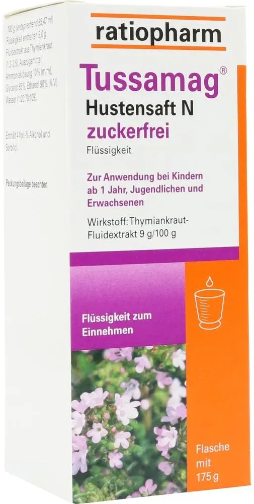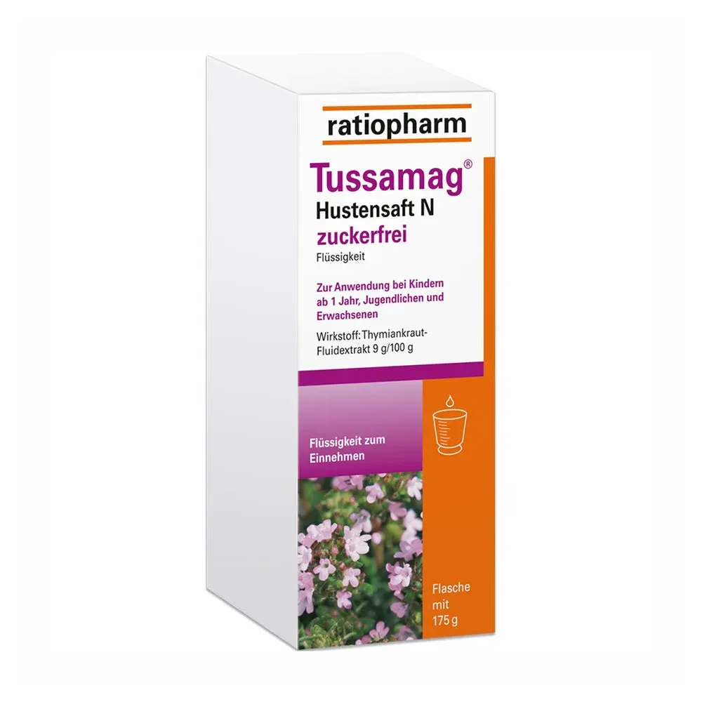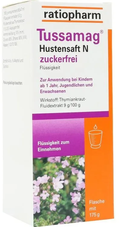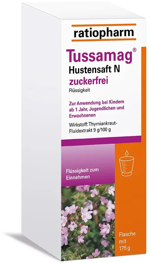 Tussamag - Anwendungsgebiet von Tussamag Hustensaft N zuckerfreiTussamag Hustensaft N zuckerfrei ist ein pflanzliches Arzneimittel bei Erkältungskrankheiten der Atemwege. Tussamag Hustensaft N zuckerfrei wird angewendet :Zur Besserung der Beschwerden bei Erkältungskrankheiten der Atemwege mit zähflüssigem Schleim und zur Besserung der Beschwerden bei akuter Bronchitis.Wirkstoffe / Inhaltsstoffe / ZutatenTussamag Hustensaft N zuckerfrei enthält: Der Wirkstoff ist: Thymiankraut-Fluidextrakt 100 g (entsprechend 85,47 ml) Flüssigkeit enthalten 9,0 g Fluidextrakt aus Thymiankraut (1:2-2,5), Auszugsmittel: Ammoniaklösung 10 % (m/m), Glycerol 85 %, Ethanol 90 % (V/V), Wasser (1:20:70:109). Die sonstigen Bestandteile sind: Kaliumsorbat, Citronensäure-Monohydrat, Zuckercouleur E 150d, Glycerol 85 %, Sorbitol-Lösung 70 % (nicht kristallisierend), Gereinigtes Wasser.GegenanzeigenDas Arzneimittel darf nicht eingenommen werdenwenn Sie überempfindlich (allergisch) gegen Thymian oder andere Lamiaceen (Lippenblütler), Birke, Beifuß, Sellerie oder einen der sonstigen Bestandteile des Präparates sind.DosierungNehmen Sie dieses Arzneimittel immer genau wie in dieser Packungsbeilage beschrieben bzw. genau nach Anweisung Ihres Arztes oder Apothekers ein. Fragen Sie bei Ihrem Arzt oder Apotheker nach, wenn Sie sich nicht sicher sind. Falls vom Arzt nicht anders verordnet, beträgt die empfohlene Dosis Alter Einnahme Erwachsene und Jugendliche ab 1 n 3- bis 4-mal täglich 20-30 ml* Schulkinder 6-1 ... Dieser zuckerfreie Hustensaft ist zu einem sehr wettbewerbsfähigen Preis erhältlich und somit eine gute Wahl. ![]() ![]() Ratiopharm Tussamag Hustensaft N Zufr 175 G