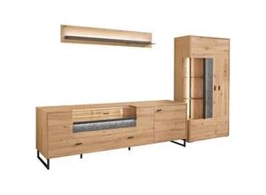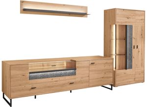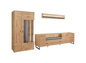 Wohnen - - Produktdetails: Set beinhaltet: Vitrine, Unterteil, Wandboard, Farbe Material: Material Korpus: Holzwerkstoff, Oberflächenbehandlung Korpus: melaminbeschichtet, Material Türen: Spanplatte, Material Beschläge: Metall, Oberflächenbehandlung Türen: melaminbeschichtet, Material Einlegeböden: Spanplatte, Material Griffe: Metall, Material Füße: Metall, Farbbezeichnung: Eiche Artisan, Material: Holzwerkstoff, Oberflächenbeschichtung: melaminharzbeschichtet, Farbe Einlegeböden: Eiche Artisan, Farbe Füße: schwarz-grau, Farbe Griffe: schwarz-grau, Farbe Korpus: Eiche Artisan, Farbe Türen: Eiche Artisan, Schrank: Art Schrank: Vitrine, Tiefe Schrank: 37,2 cm, Höhe Schrank: 170,8 cm, Gewicht Schrank: 61 kg, Anzahl Türen Schrank: 2 Stk., Art Türen Schrank: Drehtür, Belastbarkeit Einlegeböden Schrank: 3 kg, Art Schrank 2: TV-Lowboard, Anzahl Schrank 2: 1 Stk., Breite Schrank 2: 214 cm, Tiefe Schrank 2: 50 cm, Höhe Schrank 2: 66,5 cm, Gewicht Schrank 2: 77 kg, Anzahl Türen Schrank 2: 1 Stk., Anzahl Klappen Schrank 2: 1 Stk., Belastbarkeit Einlegeböden Schrank 2: 3 kg, Anzahl Schubladen Schrank 2: 2 Stk., Gesamtbreite Schränke: 317,4 cm, Höhe Füße Schrank: 12 cm, Breite Schrank: 93,7 cm, Regal: Art Regal: Wandboard, Breite Regal: 150 cm, Tiefe Regal: 20,6 cm, Höhe Regal: 24 cm, Gewicht Regal: 11 kg, Belastbarkeit Einlegeböden Regal: 3 kg, Beleuchtung: Art Leuchtmittel: LED-Leuchtmittel, Modellbezeichnung: Deltona, Lichtfarbe: warmweiß, WEEE-Reg.-Nr. DE: 49.616.694, Maßangaben: ... ![]() TV-Wand 'Deltona', braun (eiche artisan), B:317,4cm H:198cm T:50,2cm, Holzwerkstoff, SET ONE BY MUSTERRING, Kastenmöbel-Sets, Zierelemente aus Sandstein, inkl. Beleuchtung, Gesamtbreite ca. 317 cm