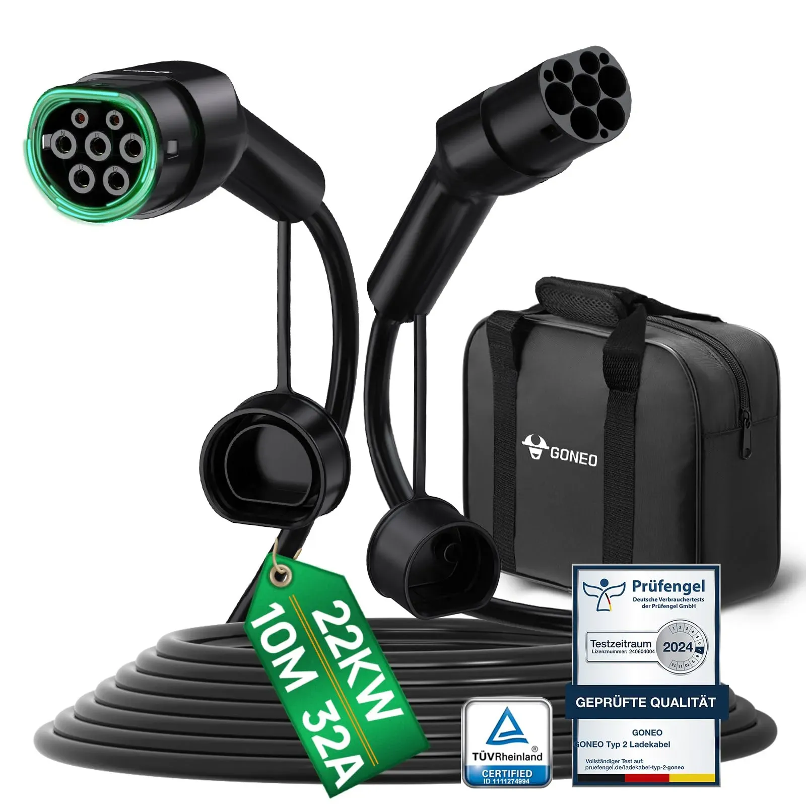 Kategorie: Ladekabel für Elektrofahrzeuge - goneo - 200% schneller als eine 7,2kW Kabel: GONEO Typ 2 Ladekabel 22kW lässt sich in nur einer Stunde eine Reichweite von 90 km erreichen. (Hinweis: 1 Kein Verlängerungskabel; verbindet nur den Ladeanschluss des Fahrzeugs mit dem der Ladestation. Andere Kabel können nicht angeschlossen werden. 2 Die Ladeleistung hängt vom Fahrzeug und der Wallbox ab. überprüfen Sie die maximale Leistung, wenn die Ladeleistung nicht den Spezifikationen entspricht) Für Europa entwickelt: GONEO Ladekabel 22kW Typ 2 st kompatibel mit Elektrofahrzeugen vom Typ 2 und CCS2 sowie Plug-in-Hybriden. Bitte prüfen Sie den Ladeanschluss Ihres Fahrzeugs (Typ 2 oder CCS2). Nicht kompatibel mit Typ 1, CCS1, CHAdeMO und GB/T Premium-Qualität: Ladekabel elektroauto typ 2 verwendet Ultraschallschweißtechnologie. Diese sorgt für einen geringeren Temperaturanstieg als herkömmliche Schweißtechnologie und schützt so Ihre Sicherheit und die Ihres Fahrzeugs. Der versilberte 8 2 Mikron Stecker sorgt für bessere Leitfähigkeit und Korrosionsbeständigkeit und gewährleistet so eine lange Lebensdauer Kaufen Sie mit Vertrauen: Das ladekabel auto 22kW 10m entspricht den Normen IEC 62196 und EN, ist wasserdicht (IP54), hat die Brandschutzklasse UL94 V-0 und besteht aus PA66-Nylon, einem hochwertigen TPU-Kabel, halogenfrei, recycelbar, verschleißfest und biegefest. Es wurde auf 10.000 Steckvorgänge getestet, hat eine Tragkraft von 2 Tonnen und hat den Falltest aus 1 Meter Wählen ... Dieses Verlängerungskabel ist ideal, wenn die Ladestation weiter vom Fahrzeug entfernt ist und bietet eine gute Schutzart. ![]() ![]() dé Typ 2 Verlängerungskabel [10m, 22kW, 32A] 3-Phasen Ladekabel 400V, Schutzart IP54, kompatibel mit Allen IEC62196-2 BEV und HPEV, mit Tragetasche