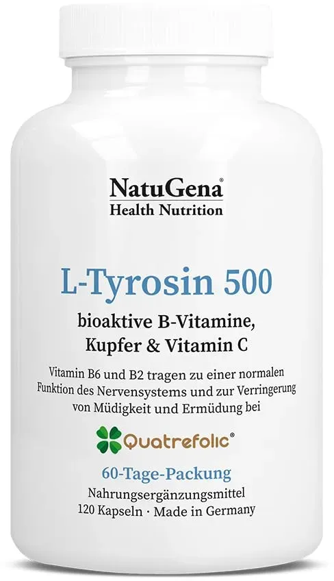 Gewöhnlich versandfertig in 4 bis 5 TagenNatuGena L-Tyrosin 500, bioaktive B-Vitamine (B3, B2, B6), Kupfer & Vitamin C, 500 mg L-Tyrosin pro Tagesdosis, 120 Kapseln (60 Tage Packung)