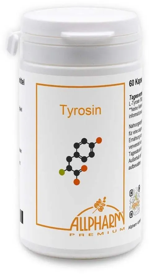 0,20 /Stück - Kategorie: Arzneimittel - Allpharm - GTIN:4150095205111 - PZN:09520511 - Nahrungsergänzungsmittel sind kein Ersatz für eine usgewogene und abwechslungsreiche Ernährung und eine gesunde Lebensweise.Tyrosin ist eine semi-essentielle Aminosäure, die bei einer Reihe von Stoffwechselprozessen eine Rolle spielt. Erwähnenswert ist hier besonders der Stoffwechsel des Gehirns und der Nervenzellen.Tyrosin ist eine Aminosäure, die in den meisten Proteinen vorkommt. Tyrosin ist im menschlichen Körper die Vorstufe von verschiedenen Botenstoffen wie Adrenalin oder den Schilddrüsenhormonen. Besonders geeignet für Sportler und aktive Personen.Zutaten:L-Tyrosin, Hydroxypropylmethylcellulose (Kapselhülle), Trennmittel Magnesiumsalze der SpeisefettsäurenNährwerte: 1 Kapsel enthältReferenzmenge (2 Kapseln)L-Tyrosin350 mg700 mgVerzehrempfehlung:Täglich 1-2 Kapseln mit etwas Flüssigkeit einnehmen.Hinweis:Die angegebene empfohlene tägliche Verzehrmenge darf nicht überschritten werden.Aufbewahrung: Kühl (6-25 C) und lichtgeschützt lagern. Außerhalb der Reichweite von kleinen Kindern aufbewahren.Nettofüllmenge:60 Kapseln = 27,2 gHersteller:Allpharm Vertriebs-GmbHLanggasse 6364409 Messel - 11,99 Euro bei Shop Apotheke DE - gefunden von billiger.de Fairvital bietet einen L-Tyrosin Komplex mit 13 Vitalstoffen, der eine breite Unterstützung für verschiedene Körperfunktionen bietet. ![]() ![]() Fairvital | L-Tyrosin Komplex - 60 Kapseln - 13 Vitalstoffe pro Kapsel - mit Curcumin, Taurin, B-Vitaminen und Mineralstoffen - Made in Germany