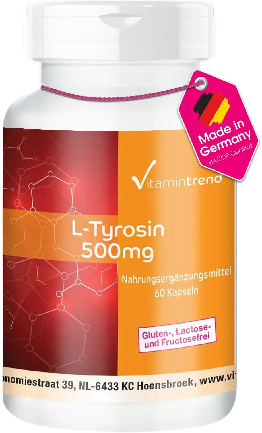 46,60 /kg - Kategorie: Nahrungsergänzungsmittel - Medverita - GTIN:5900718340069 - Medverita Tyrosin 500 mg 50 Kapseln Tyrosin ist eine organische Verbindung , die eine Proteinaminosäure ist.L-Tyrosin gehört zu den Gruppe körpereigener Aminosäuren, die der Körper selbst synthetisieren kann.Zutaten: Tyrosin (L-Tyrosin), Gelatine (Kapselhülle). Nettoinhalt: 50 KapselnKapselgewicht: 620 mgEmpfohlene Tagesdosis: 1 Kapsel pro Tag, vorzugsweise während einer Mahlzeit.Die Tagesportion enthält:L-Tyrosin - 500 mg.Das Nahrungsergänzungsmittel enthält keine unnötigen: Füllstoffe, Bindemittel , Trennmittel, Adsorbentien, Konservierungsmittel, Beschichtungsstoffe, Gleitmittel.Hinweise: Die empfohlene Tagesdosis darf nicht überschritten werden. Außerhalb der Reichweite von kleinen Kindern aufbewahren. Das Nahrungsergänzungsmittel kann nicht als Ersatz für eine abwechslungsreiche Ernährung verwendet werden. Es wird nicht für schwangere Frauen und während der Stillzeit empfohlen.Hersteller : Medverita Group Paulina Schroeder ul. Stroma 6/2 Krakau 30-521. - 6,99 Euro bei Kaufland.de - gefunden von billiger.de Vitamintrend bietet eine preiswerte Option für 60 hochdosierte L-Tyrosin Kapseln in deutscher Qualität. ![]() ![]() L-Tyrosin 500mg - 60 Kapseln - Proteinogene Aminosäure - hochdosiert - bioverfügbare Supplements aus Deutschland | Vitamintrend