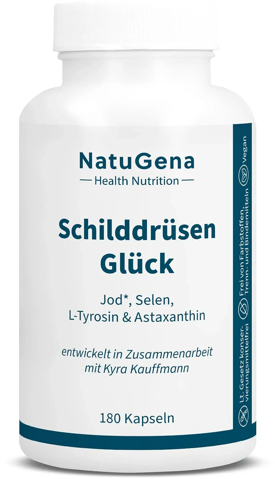Kategorie: Nahrungsergänzungsmittel - NatuGena - GTIN:4260633572268 - SchilddrüsenGlück Sinnvoll kombinierter Jod-Komplex mit 250 g Jod als Kaliumjodid pro Kapsel ergänzt mit 250 mg L-Tyrosin,100 g Selen und 1 mg Astaxanthin aus der Mikroalge Haematococcus pluvialis. Entwickelt mit Heilpraktikerin Kyra Kauffmann. Jod ist ein essenzielles Spurenelement und unverzichtbar für die Bildung der Schilddrüsenhormone Thyroxin (T4) und Triiodthyronin (T3). Jod trägt zu einer normalen Produktion von Schilddrüsenhormonen und zu einer normalen Schulddrüsenfunktion bei. L-Tyrosin ist eine vielseitige Aminosäure und ein wichtiger Baustein für Neurotransmitter wie Dopamin, Adrenalin und Noradrenalin. Zudem ist es essenziell für die Produktion der Schilddrüsenhormone T3 und T4. Selen - ein lebenswichtiges Spurenelement, das besonders wichtig für die normale Funktion der Schilddrüse ist. Es ist in über 25 Selenoenzymen enthalten, die an einer Vielzahl von biologischen Reaktionen im Körper beteiligt sind. Das enthaltene Astaxanthin - eine mikroskopisch kleine Alge ist bekannt für ihre Fähigkeit, unter extremen Umweltbedingungen hohe Mengen natürliches Carotinoids zu bilden. Ein natürlicher Pflanzenfarbstoff mit starken antioxidativen Eigenschaften. - 34,95 Euro bei Amazon Marketplace Health & Personal Care - gefunden von billiger.de NatuGena kombiniert L-Tyrosin mit bioaktiven B-Vitaminen, Kupfer und Vitamin C, was eine umfassendere Unterstützung bietet. ![]() ![]()