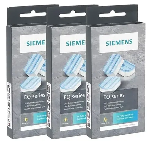 Kategorie: Kaffeezubehör & Espressozubehör - Siemens - ORIGINAL Herstellerzubehör im VORTEILSPACK Geeignet für alle EQ.9, EQ.8, EQ.7, EQ.6, EQ.5 und Einbauvollautomaten Optimiert für das automatische CALCnCLEAN-Programm von EQ Kaffeevollautomaten 2in1: Entfernt Kalk und schützt vor Korrosion - 36,99 Euro bei Amazon Marketplace Health & Personal Care - gefunden von billiger.de Dieses Angebot von MEISTERZWECK4U mit 4x3 Stück Entkalkungstabletten ist eine kostengünstige Option für den Langzeitgebrauch. ![]() ![]() MEISTERZWECK4U TZ80002 Entkalkungstabletten 4x3 Stück, kompatibel mit Siemens - für alle EQ & supresso Kaffeevollautomaten - Reinigung, Entkalkung von Kaffeemaschinen - Korrosionsschutz