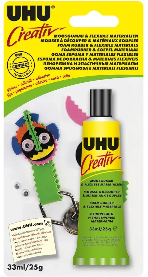 Zustand: Neu - 57,00 € / kg - Bastelkleber - UHU - 38995 38996 - EAN: 4026700389951 - UHU Arts & Crafts Kleber - der lösungsmittelfreie Bastelkleber für kreativen Spielspaß Weiche Flasche - ideal für Kinder Mit integriertem Spachtel Auswaschbar bei 30°C Trocknet transparent und lösungsmittelfrei - bei Amazon.de Dieser UHU Creativ Spezialklebstoff für Moosgummi und flexible Materialien ist schnell trocknend und sorgt für eine flexible und dauerhafte Verklebung. ![]() ![]() UHU Creativ' Spezialklebstoff für Moosgummi und flexible Materialien Tube, Schnell trocknender, flexibler Kontaktkleber 33ml
