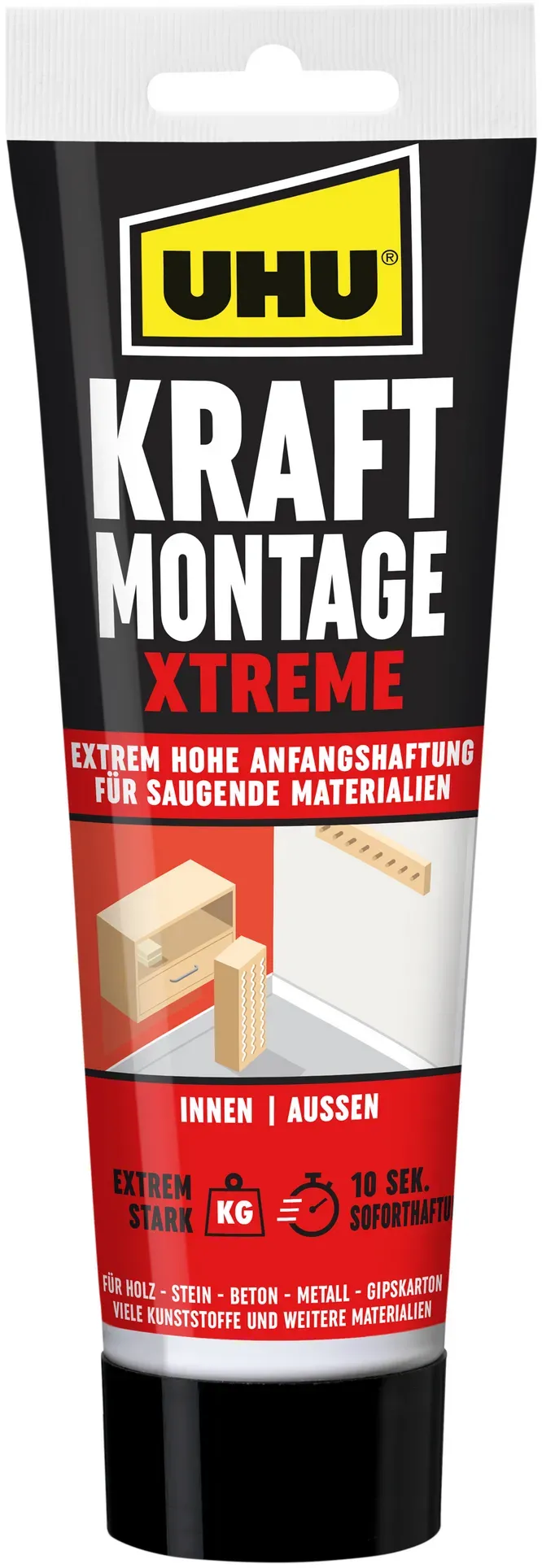8 Händlerangebote bei billiger.de - Kategorie: Klebeprodukte - UHU - Transparenter, universeller Kraftkleber Schnell, super stark und elastisch Für einseitiges oder doppelseitiges Kleben (Kontaktkleben) geeignet UV-Licht beständig und wasserfest - GTIN:4026700450651 Der Montagekleber Kraft Montage Xtreme in der 175g Tube bietet eine extrem hohe Klebekraft für anspruchsvolle Projekte. ![]() ![]() UHU Montagekleber Kraft Montage Xtreme' Tube 175g