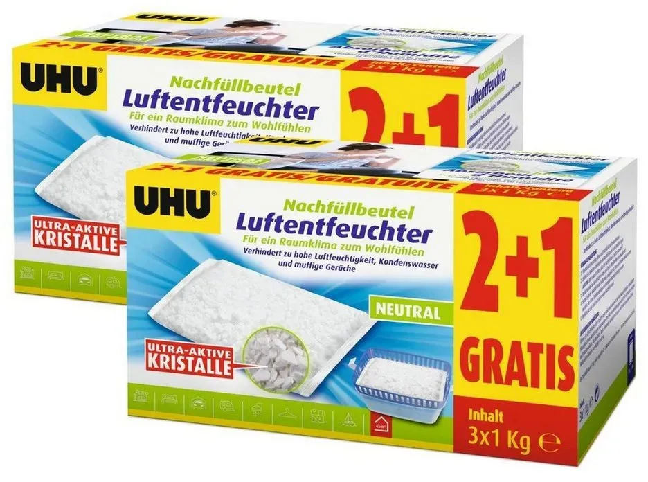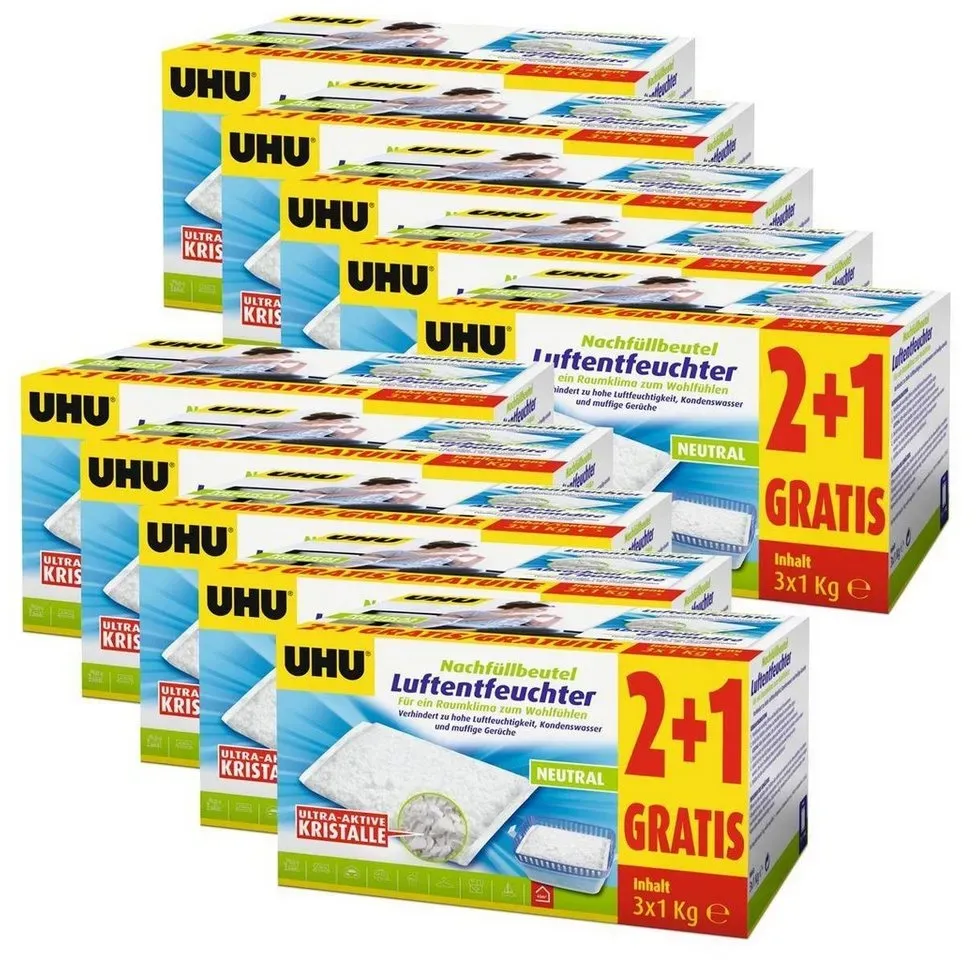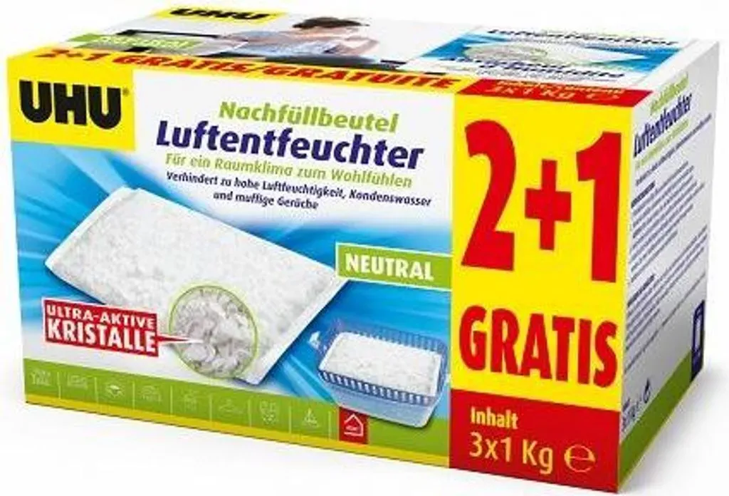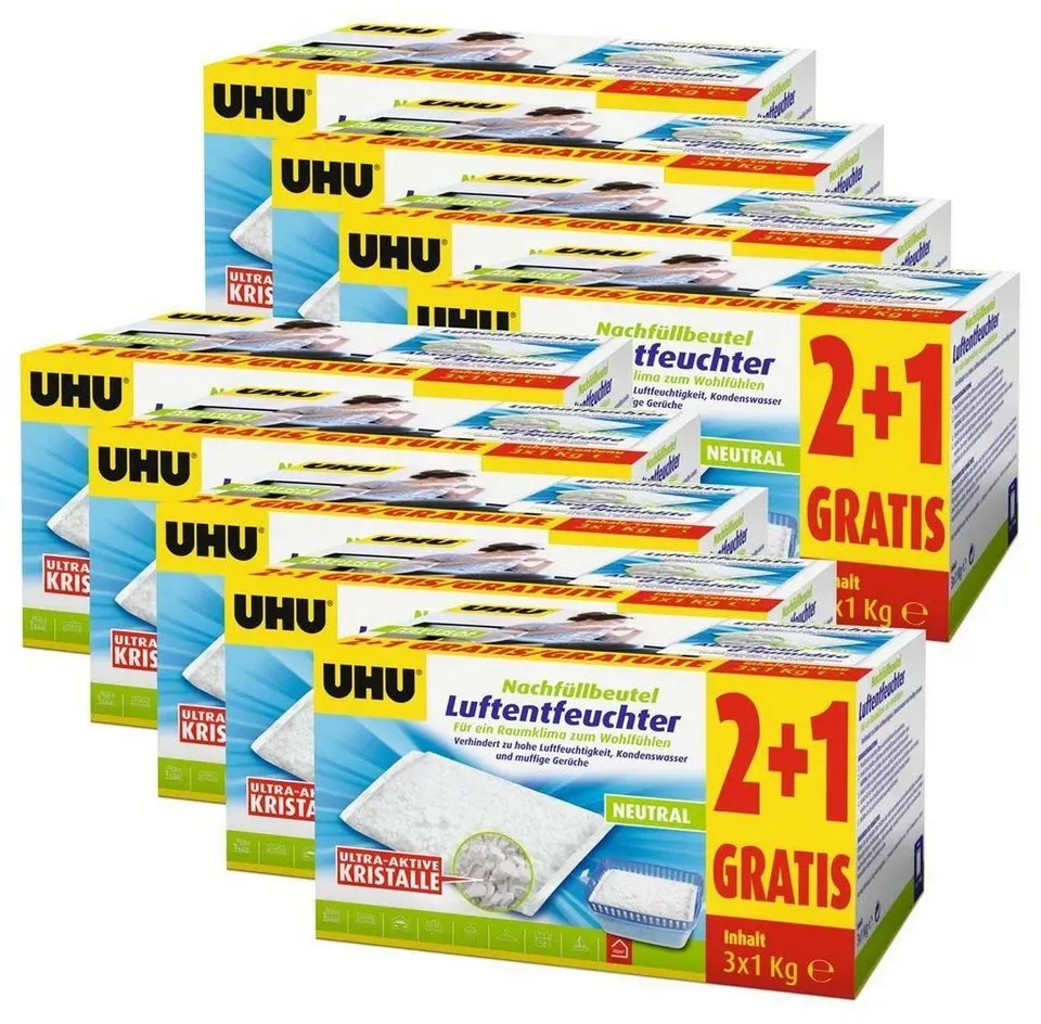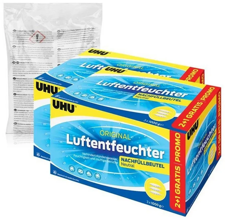 4.51 /1kg - Kategorie: Luftentfeuchter - UHU - GTIN:4055902094080 - Allgemein Weitere Vorteile , Wohnraum, - 121,89 Euro bei OTTO - gefunden von billiger.de Dieses große 10er-Pack mit 3x1000g Nachfüllbeuteln bietet die maximale Ersparnis für den dauerhaften Einsatz in großen Bereichen. ![]() ![]()