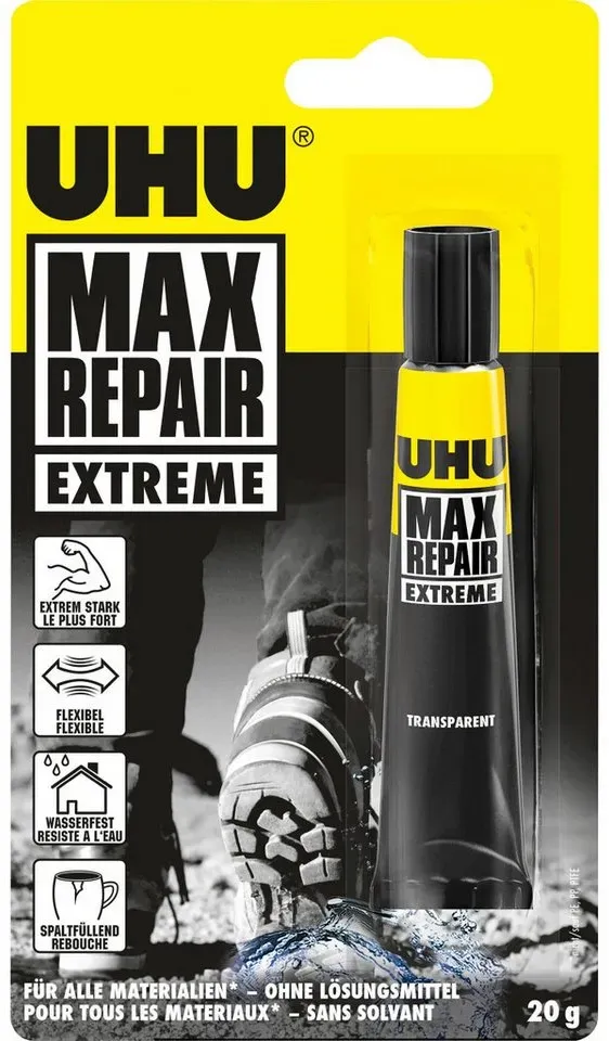 12 Händlerangebote bei billiger.de - Kategorie: Klebeprodukte - UHU - UHU max repair Universalkleber 8 g Tube Dieser Universalkleber ist ein innovativer Alleskleber für 1001 Reparaturen im Innen- und Außenbereich. Max Repair ist extra stark, sehr elastisch, wasserfest und fugenfüllend. wasserfest, lösungsmittel- und säurefrei Flexibel, beständig gegen Vibrationen und Erschütterungen für praktisch alle Materialien und Oberflächen geeignet fugenfüllend & lackierbar starke und lang haltende Haftung temperaturbeständig von -40°C bis +120°C transparent & resistent gegen UV-Licht Max Repair Universal ist ein vielseitiger Klebstoff für alle Anwendungen im Innen- und Außenbereich; zum Kleben von porösen und glatten Materialien, wie Holz, Papier, Textilien, Leder, Kork, Metall, Glas, Kunststoff, Gummi, Keramikfliesen, Stein und vielen anderen Materialien. Max Repair Universal basiert auf der UHU Polymertechnik. Produkte, die auf dieser Technik basieren, ren eine universelle, starke, flexible, lang haltende, sichere und benutzerfreundliche Alltagslösung. - GTIN:4026700458657 Dieses Angebot ist mit 3,35 Euro ebenfalls sehr preiswert für eine 8g Tube UHU Max Repair Extreme. ![]() UHU Max Repair Extreme Alleskleber 8,0 g