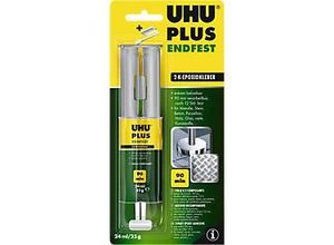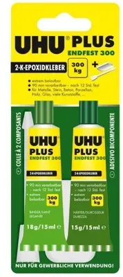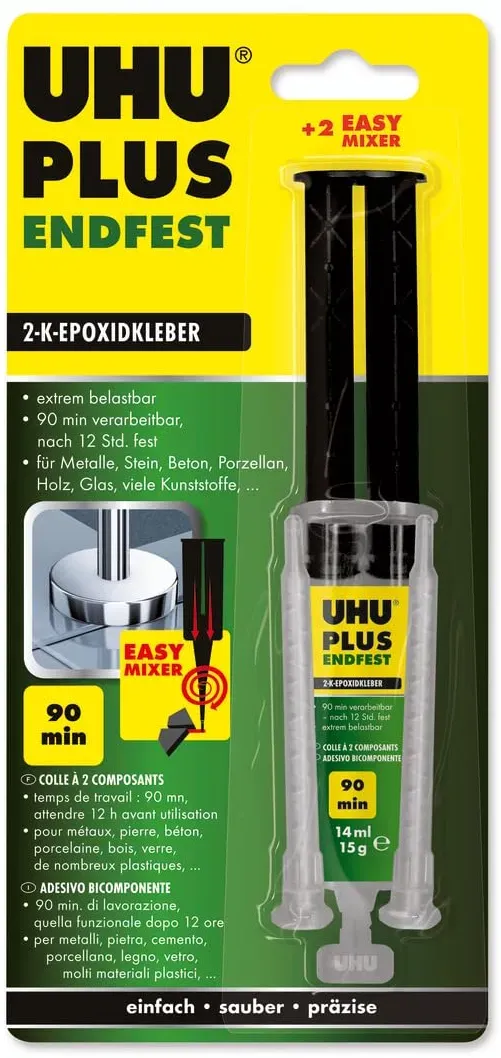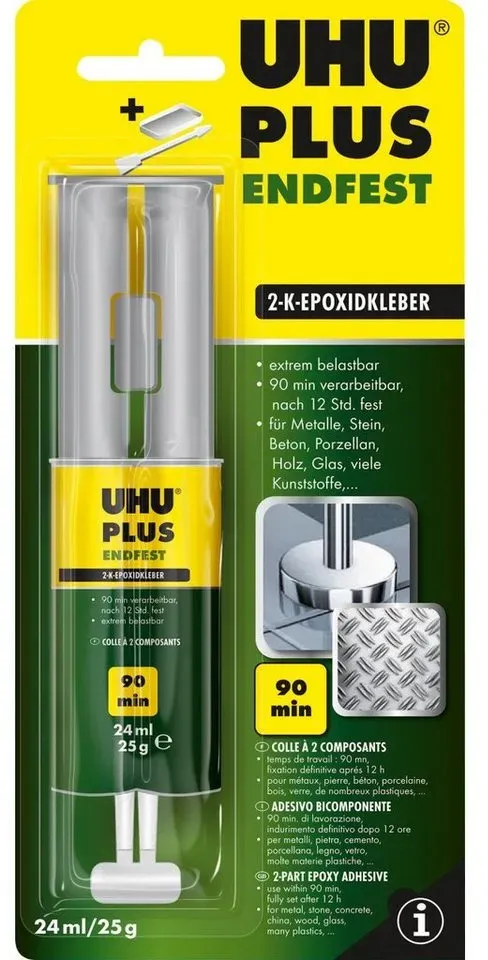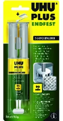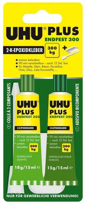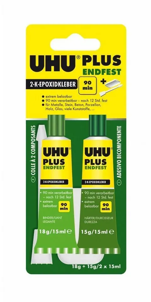 Klebefilme, -bänder Abroller Wohnen Arbeiten Büro- Schreibwaren Büroartikel Klebematerial - - Wenn es wirklich fest werden mussDer lösungsmittelfreie 2 Komponenten-Kleber UHU plus endfest ist perfekt für höchste Belastungen geeignet. Der Verarbeitungszeitraum liegt bei bis zu 90 Minuten - somit können Sie sich Zeit lassen und in Ruhe noch Korrekturen vornehmen. Bei normaler Raumtemperatur ist der UHU 2 Komponenten-Kleber plus endfest nach 12 bis 24 Stunden fest. Die entstandene Klebung ist schlagfest und beständig gegen Alterung und Feuchtigkeitseinwirkung.Der wasserfeste UHU 2 Komponenten-Kleber plus endfest ist geeignet für folgende Materialien: Metalle, Glas, Porzellan, Keramik, Holz, Marmor, Stein, Beton, Duroplast, glasfaserverstärkte Kunststoffe, Hart-PVC, Gummi und Hartschaum-Kunststoffe wie z.B. Styropor. Nicht geeignet ist er dagegen für Klebungen auf großen Glasflächen, PE und PP.Verfügen auch Sie zusammen, was zusammengehört, und bestellen Sie das UHU-Set bestehend aus Binder und Härter jetzt in unserem Online Shop.Gefahrenhinweise:- Verursacht Hautreizungen.- Verursacht schwere Augenreizung.- Kann allergische Hautreaktionen verursachen.- Giftig für Wasserorganismen, mit langfristiger Wirkung.Sichervheitshinweise:- Ist ärztlicher Rat erforderlich, Verpackung oder Kennzeichnungsetikett bereithalten.- Darf nicht in die Hände von Kindern gelangen.- Vor Gebrauch Kennzeichnungsetikett lesen.- Einatmen von Staub/Rauch/Gas/Nebel/Dampf/Aerosol vermeiden.- ... Mit 8,16 Euro für eine 90-Minuten-Doppelkammerspritze ist dies eine preiswerte und praktische Option für kleinere Reparaturen. ![]() ![]() UHU PLUS endfest 90 min Doppelkammerspritze, Infokarte