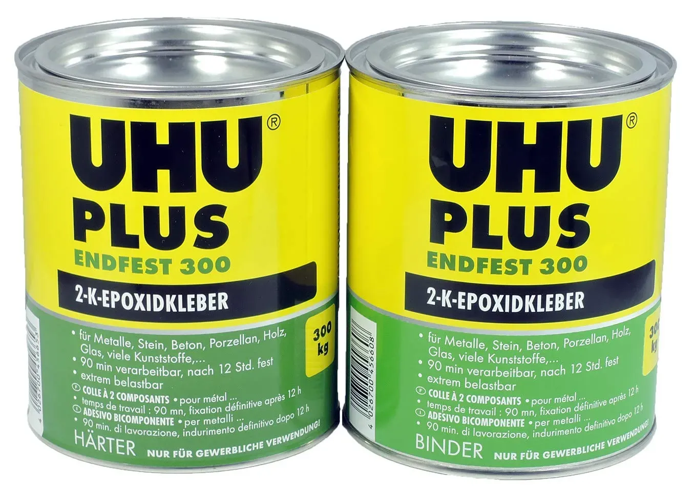 Kategorie: Klebeprodukte - UHU - GTIN:4026700456301 - Die Verarbeitungszeit beträgt bis zu 120 Minuten Hochfest, schlagfest und beständig gegen Alterung und Feuchtigkeitseinwirkung - 36,19 Euro bei Amazon Marketplace Home Improvement - gefunden von billiger.de Für 169,95 Euro erhalten Sie hier eine große Menge von 915g Binder und 740g Härter, perfekt für Großverbraucher oder industrielle Anwendungen. ![]() ![]() UHU Plus Endfest 300 1x Dose Binder 915g + 1x Dose Härter 740g 2-K-Epoxidharzklebstoff