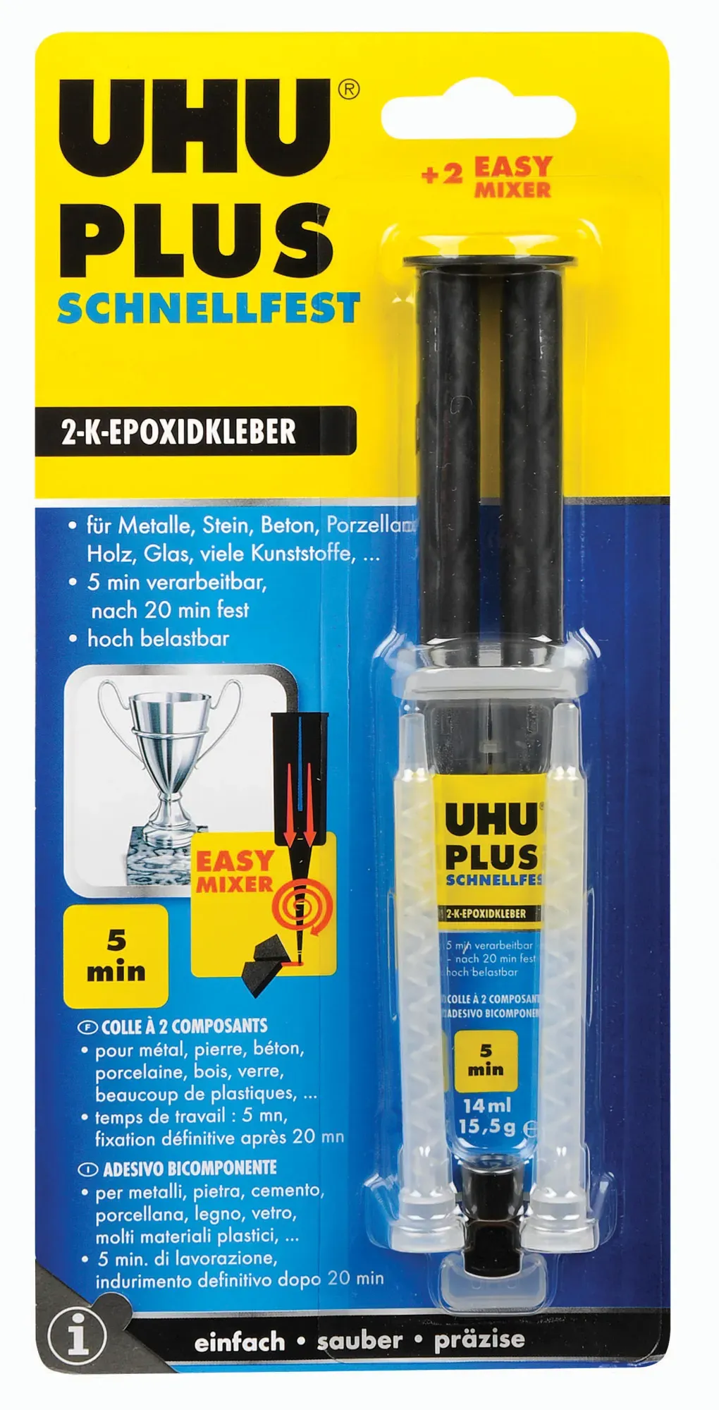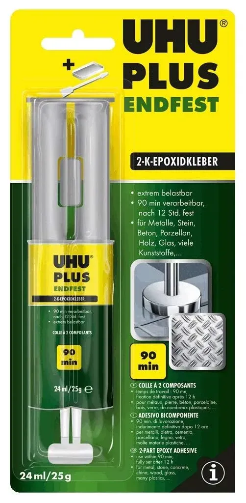 Klebefilme, -bänder Abroller Wohnen Arbeiten Büro- Schreibwaren Büroartikel Klebematerial - - Wenn es schnell belastbar kleben mussDer lösungsmittelfreie 2 Komponenten-Kleber UHU plus sofortfest ist perfekt für starke Belastungen und kleine Flächen geeignet. Setzen Sie ihn zum Kleben von Glas, Kunststoff, Holz, Metall, Stein, Beton, Keramik ein. Einfach und schnelle HandhabungDie Verarbeitungszeit liegt bei diesem 2-Komponten-Kleber bei 2 Minuten, die Handfestigkeit bei ca. 5 Minuten. Nach 60 Minuten ist der UHU plus sofortfest bei Raumtemperatur komplett ausgehärtet. Er fällt dann auch kaum auf, denn er ist transparent. Die entstandene Klebung ist schlagfest und beständig gegen Alterung und Feuchtigkeitseinwirkung.Fügen Sie zusammen, was zusammengehört, und bestellen Sie das UHU-Set bestehend aus Binder und Härter jetzt in unserem Online-Shop.Beachten Sie die Sicherheits- und Gefahrenhinweise:Gefahrenhinweise:- Verursacht Hautreizungen.- Verursacht schwere Augenreizung.- Kann allergische Hautreaktionen verursachen.- Giftig für Wasserorganismen, mit langfristiger Wirkung.Sicherheitshinweise:- Ist ärztlicher Rat erforderlich, Verpackung oder Kennzeichnungsetikett bereithalten.- Darf nicht in die Hände von Kindern gelangen.- Vor Gebrauch Kennzeichnungsetikett lesen.- Einatmen von Staub/Rauch/Gas/Nebel/Dampf/Aerosol vermeiden.- Schutzhandschuhe/Schutzkleidung/Augenschutz/Gesichtsschutz tragen.- Freisetzung in die Umwelt vermeiden.- BEI BERüHRUNG MIT DER HAUT: Mit viel Wasser ... Diese Doppelkammerspritze UHU plus endfest 90 min für 10,44 Euro ist eine praktische und erschwingliche Wahl. ![]() ![]() UHU plus endfest 90 min Doppelkammerspritze 25 g