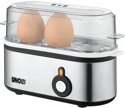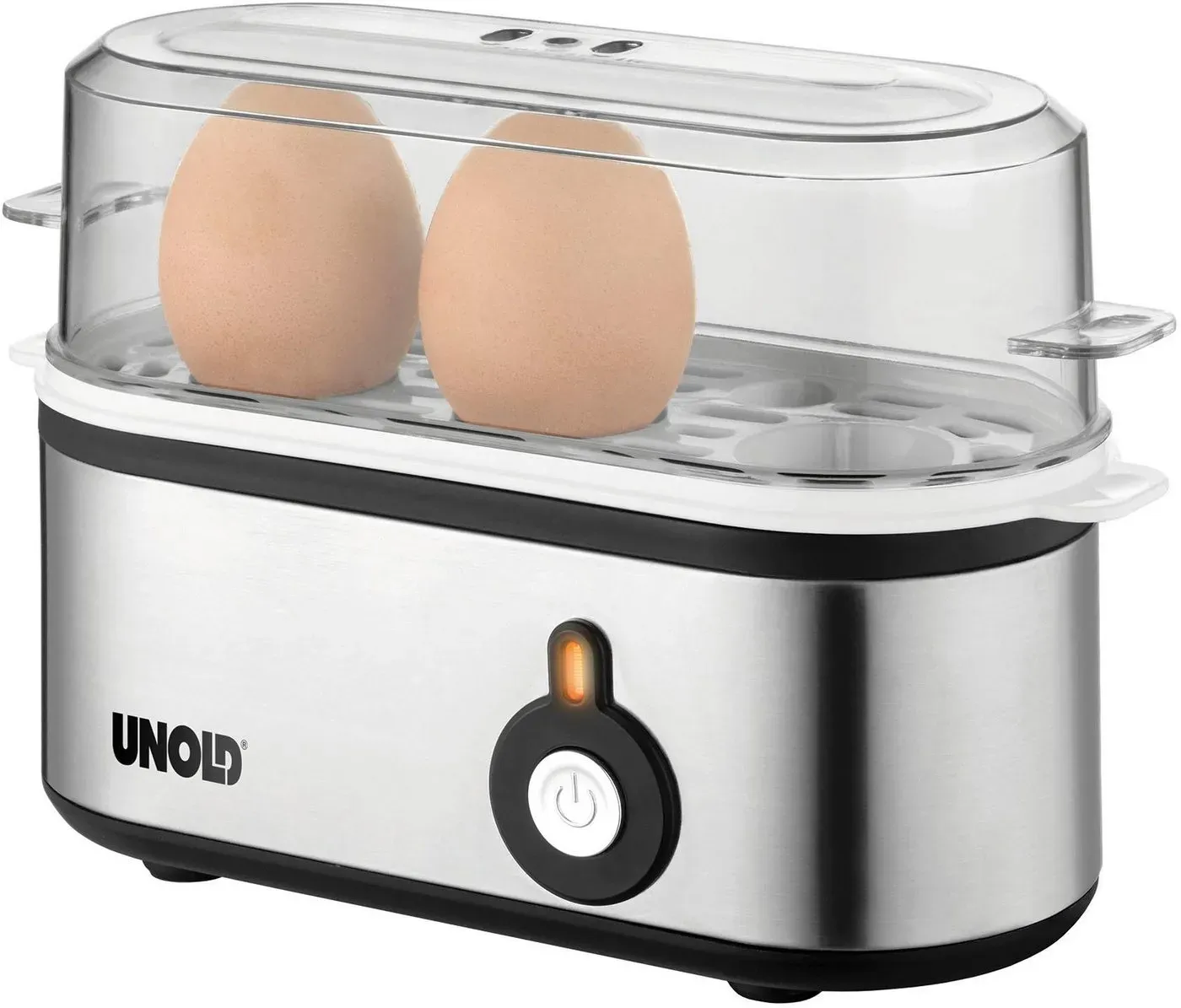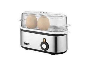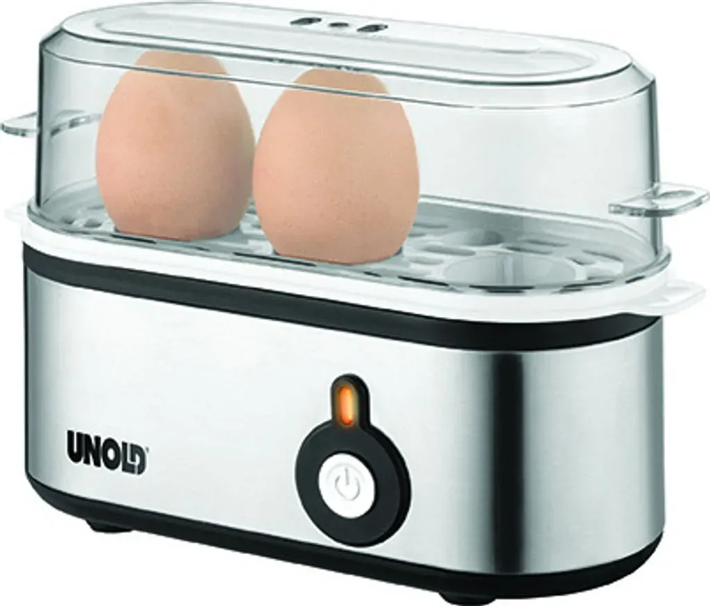Auf Lager Versand durch AmazonUNOLD 38610 Eierkocher Mini, Edelstahgehäuse, Eiereinsatz mit Griff für 1 bis 3 Eier, Signalton, Betriebskontrollleuchte und 210 W, inkl. Messbecher
