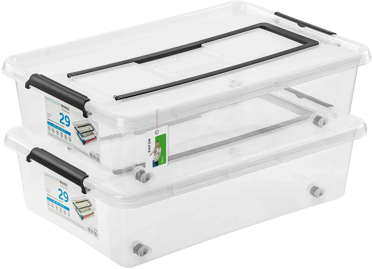 Zustand: Neu - Unterbettkommoden - Sibosen - Under Bed Storage with Wheels Unterbettkommode mit Rollen - - Groes Fassungsvermgen: Diese Unterbett Aufbewahrungsbox verfgt ber ein groes Fassungsvermgen von 65-82L und eignet sich ideal fr die Aufbewahrung von Kleidung, Schuhen, Decken und vielem mehr. Die Hhe lsst sich zwischen 20 und 24 cm einstellen, sodass sie flexibel an die Hhe des Unterbettbereichs angepasst werden kann. So wird ungenutzter Platz effektiv genutzt und Ihr Zuhause wird aufgerumter 360drehbare Rder: Diese Unterbettkommode mit Rollen ist mit 360-Drehrollen ausgestattet. Die Rollen drehen sich leichtgngig und lassen sich problemlos auf Hartholz, Fliesen oder Teppichen bewegen, sodass Sie beim Ein- und Ausrumen keine Kraft aufwenden mssen, was die Benutzerfreundlichkeit erheblich verbessert Transparent Sichtbarer Deckel: Diese Unterbett-Aufbewahrungsbox mit Rollen verfgt ber einen transparenten Deckel und Etiketten, sodass Sie den Inhalt der Box ohne sie zu ffnen klar erkennen und die bentigten Gegenstnde schnell finden knnen. Das erspart Ihnen das mhsame Suchen und macht die Verwaltung Ihrer Gegenstnde effizienter Robuste und langlebige Konstruktion: Diese Bettkasten Organizer verfgt ber eine verbesserte Konstruktion, die einen Metallrahmen mit Oxford-Stoff kombiniert. Der Metallrahmen bietet der Aufbewahrungsbox stabilen Halt und ist rei- und verformungsbestndig. Der Oxford-Stoff ist abriebfest, feuchtigkeitsbestndig und ... Dieses 2er-Set von PAFEN bietet für 27.99 Euro transparente Boxen mit 29L Fassungsvermögen, Rollen und Griffen. ![]() ![]() PAFEN 2x Unterbettkommode Aufbewahrungsbox 29L mit Rollen und Griff - 38,5 x 16 x 57,5 cm - Transparent Boxen Aufbewahrung Stapelboxen mit Verschlussclips Kunststoffbehälter