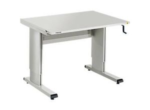 Arbeitstische Wohnen Arbeiten - - Der rechteckige, dank Spindelhubantrieb mit Synchronsteuerung elektrisch höhenverstellbare Arbeitstisch von Schäfer Shop Genius überzeugt durch ein hohes Maß an Belastbarkeit und Leistungsstärke. So beträgt seine maximale Tragkraft bis zu 400 kg, der Verstellbereich der Höhe bis zu 400 mm (717 bis 1117 mm) bei einer Hubgeschwindigkeit von 12 mm in der Sekunde. Somit ermöglicht er zudem jederzeit das komfortable und ergonomische, den Rücken schonende und auf die individuellen Bedürfnisse anpassbare Arbeiten aus dem Stand heraus. Der Arbeitstisch ist mit einer 40 mm starken Arbeitsplatte aus mehrschichtverleimter Buche in den Maßen B 1500 x T 700 x H 40 mm ausgestattet. Diese ruht auf einem in demontiertem Zustand gelieferten T-Fuß Untergestell aus eloxiertem Aluminium. Neben 2 Tischfüßen mit oberflächenschonenden Kunststoffgleitern umfasst es eine Traverse sowie 2 Hubsäulen. Dank vormonierter Universalverbinder kann die Traverse unkompliziert in die an 3 Seiten angebachten, 8 mm breiten Nuten der Hubsäulen eingeschoben und mittels eines Sechskantschlüssels festgeklemmt werden. Genauso wird hierdurch bei diesem Arbeitstisch von Schäfer Shop Genius der optionale Anbau von Zwischenablagen oder An- und Aufbauten ermöglicht. Beide Hubsäulen werden mittels Steckverbindung an die Synchronsteuerung angeschlossen und sind umgehend einsatzbereit. Integriert in beide Hubsäulen ist jeweils ein eigener Motor welcher eine Gewindespindel mit einer ... ![]() WB-Arbeitstisch mit HandkurbelTreston Arbeitstisch Serie WB, mit Handkurbel, höhenverstellbar,