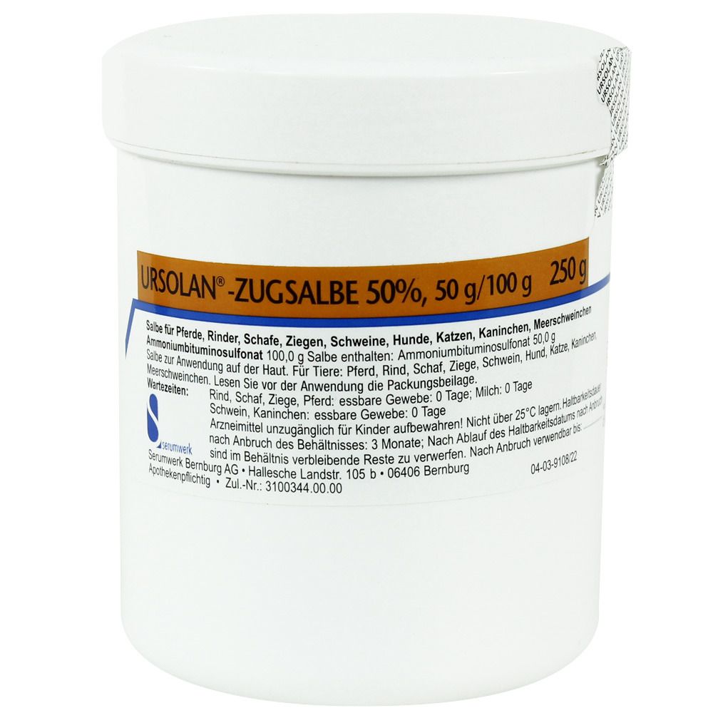 serumwerk bernburg - EAN: 4150019879428 - Salbe für Pferde, Rinder, Schafe, Ziegen, Schweine, Hunde, Katzen, Kaninchen und Meerschweinchen 100g Salbe enthalten: Ammoniumbituminosulfonat 50g Salbe zur Anwendung auf der Haut. Lesen Sie vor der Anwendung die Packungsbeilage. Wartezeiten:Rind, Schaf, Ziege und Pferd: essbare Gewebe: 0 Tage; Milch 0 TageSchwein und Kaninchen: essbare Gewebe: 0 Tage - bei shop-apotheke.com - aus Yadore Produktdaten ![]() URSOLAN-Zugsalbe 50% vet. 250 g Salbe
