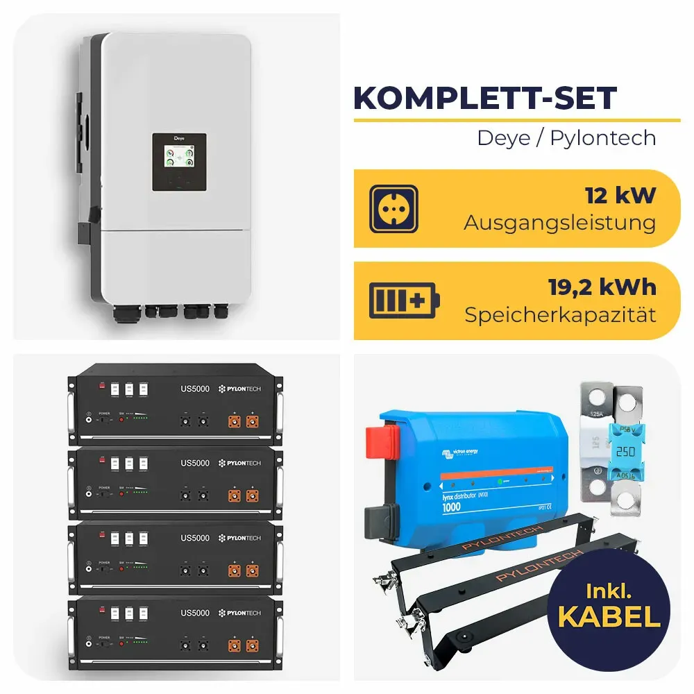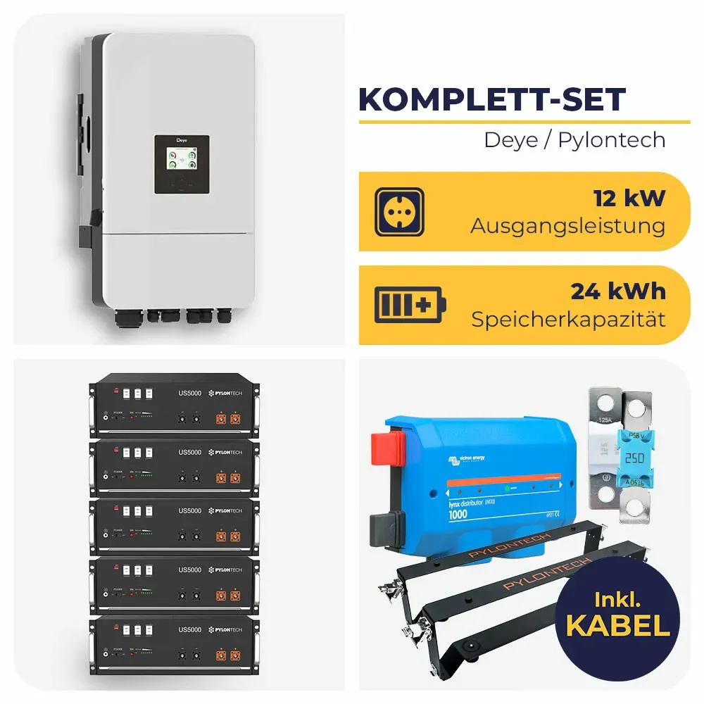 Verfügbarkeit: 2-5 Werktage - Kategorie: Stromspeicher - husatech - Niedervolt-Speicher mit 12 kW Leistung und 19,2 kWh Speicherkapazität Dieses dreiphasige Niedervolt-Speichersystem besteht aus dem Deye Hybrid-Wechselrichter SUN-12K-SG05LP3-EU-SM2 mit 12 kW Ausgangsleistung und vier Pylontech 5000 1-C Akkus, die es auf 19,2 kWh Gesamtspeicherkapazität bringen. Zusammen sind sie ein hochwertiges Batteriespeichersystem für Deine PV-Anlage. Ein regelrechtes Dream-Team also. Die maximale PV-Eingangsleistung beträgt 24 kW. Die vier Speichereinheiten des Pylontech Batteriespeichers kommen mit jeweils 4,8 kWh Speicherkapazität, von denen jeweils 4,56 kWh nutzbar sind. Der Hersteller verspricht über 6000 Ladezyklen. Wechselrichter und Batteriespeicher kommen mit bis zu 1 n Hersteller- . Somit bist Du mit diesem Speichersystem für Deine PV-Anlage für eine sehr lange Zeit auf der sicheren Seite. Im Lieferumfang stecken nicht nur der Wechselrichter mit WiFi-Dongle und vier Pylontech Speichereinheiten, sondern auch die Anschlusskabel für die Batterien sowie für die Verbindung der Batterien zum Inverter. Zudem gibt es vier Paar Pylontech Brackets dazu, mit denen Du die Akkus untereinander fest verbindest. Damit kannst Du sie sicher aufstellen und sie haben genug Zwischenraum, damit die Luft perfekt zwischen den einzelnen Speichereinheiten zirkulieren kann. Und natürlich sind auch die Komponenten für den absolut sicheren Betrieb mit dabei. Enthalten ist der Victron Lynx ... Dieses Deye Hybrid-Wechselrichter-Set mit fünf Pylontech US5000 Batterien ist eine sehr leistungsstarke 3-phasige Lösung mit 24 kWh Speicherkapazität für größere Anforderungen. ![]() ![]() husatech Deye Hybrid-Wechselrichter SUN-12K-SG05LP3 mit 5 x Pylontech US5000 1-C | 3-phasig | 12 kW | 24 kWh