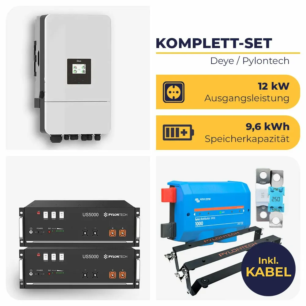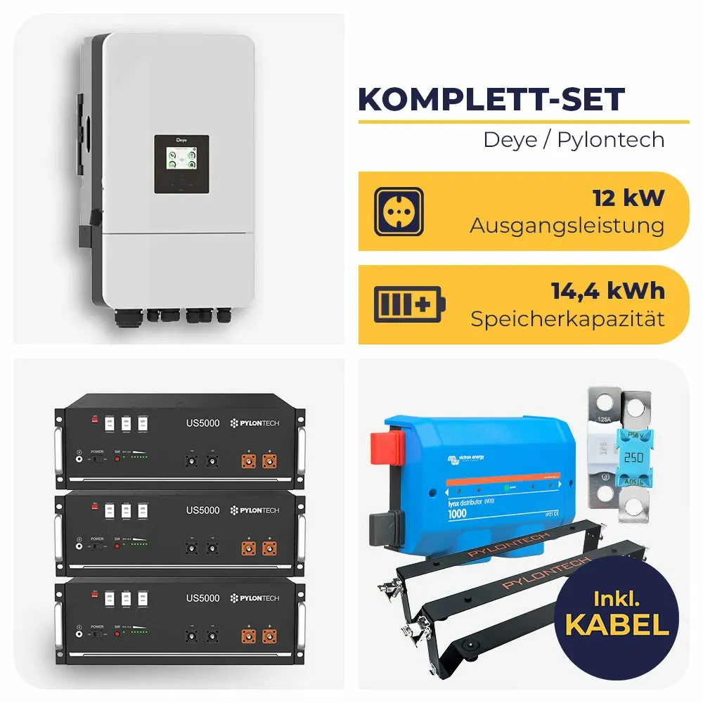 Verfügbarkeit: 2-5 Werktage - Kategorie: Stromspeicher - husatech - Niedervolt-Speicher mit 12 kW Leistung und 9,6 kWh Speicherkapazität Dieses dreiphasige Niedervolt-Speichersystem besteht aus dem Deye Hybrid-Wechselrichter SUN-12K-SG05LP3-EU-SM2 mit 12 kW Ausgangsleistung und zwei Pylontech 5000 1-C Akkus, die es auf 9,6 kWh Gesamtspeicherkapazität bringen. Zusammen sind sie ein hochwertiges Batteriespeichersystem für Deine PV-Anlage. Ein regelrechtes Dream-Team also. Die maximale PV-Eingangsleistung beträgt 24 kW. Die zwei Speichereinheiten des Pylontech Batteriespeichers kommen mit jeweils 4,8 kWh Speicherkapazität, von denen jeweils 4,56 kWh nutzbar sind. Der Hersteller verspricht über 6000 Ladezyklen. Wechselrichter und Batteriespeicher kommen mit bis zu 1 n Hersteller- . Somit bist Du mit diesem Speichersystem für Deine PV-Anlage für eine sehr lange Zeit auf der sicheren Seite. Im Lieferumfang stecken nicht nur der Wechselrichter mit WiFi-Dongle und zwei Pylontech Speichereinheiten, sondern auch die Anschlusskabel für die Batterien sowie für die Verbindung der Batterien zum Inverter. Zudem gibt es zwei Paar Pylontech Brackets dazu, mit denen Du die Akkus untereinander fest verbindest. Damit kannst Du sie sicher aufstellen und sie haben genug Zwischenraum, damit die Luft perfekt zwischen den einzelnen Speichereinheiten zirkulieren kann. Und natürlich sind auch die Komponenten für den absolut sicheren Betrieb mit dabei. Enthalten ist der Victron Lynx ... Dieses Deye Hybrid-Wechselrichter-Set mit drei Pylontech US5000 Batterien ist eine leistungsstarke 3-phasige Option mit 14,4 kWh Speicherkapazität. ![]() ![]() husatech Deye Hybrid-Wechselrichter SUN-12K-SG05LP3 mit 3 x Pylontech US5000 1-C | 3-phasig | 12 kW | 14,4 kWh