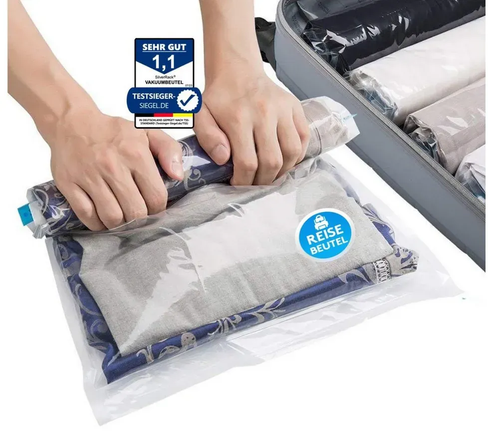 lieferbar-in 3-4 Werktagen bei dirSilverRack Vakuumierbeutel Reise Set - in versch. Größen - Vakuum Kleiderbeutel, Travel Vakuumbeutel für Kleidung zum Rollen - Kleider Vakuumierbeutel