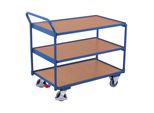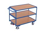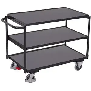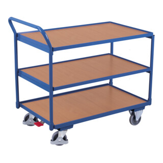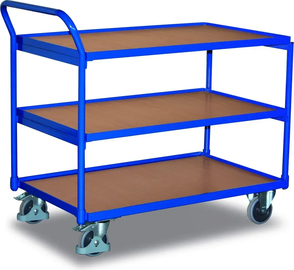 Rollwagen -regale Wohnen Aufbewahren Ordnen - - Eigenschaften: Aus Stahlrohr geschweißt Schlag- und kratzfest Schiebegriff nach oben gerichtet Boden und Etagenböden eingelegt in Winkelstahlrahmen mit 15 mm hohem Rand Boden und Etagenböden aus MDF-Platte, Oberfläche Buchendekor Traglast obere und mittlere Etage: 80 kg Farbe: RAL 5010 enzianblau pulverbeschichtet Radsatz:Bereifung aus thermoplastischem Gummi auf Kunststofffelge mit Präzisions-Rillenkugellager, grau, spurlos, Ø 125 mm, 2 Lenkrollen mit Zentralbremse EasySTOP und 2 Bockrollen, Lenkrollen mit Fußschutz Traglast: 250 kg (sw-500.600) - Versandkostenfrei: true - - - bei 342032 / Contorion - gefunden von shopping24 ![]() ![]() VARIOfit Tischwagen mit 3 Ladeflächen 835 x 495 mm Schiebegriff waagerecht