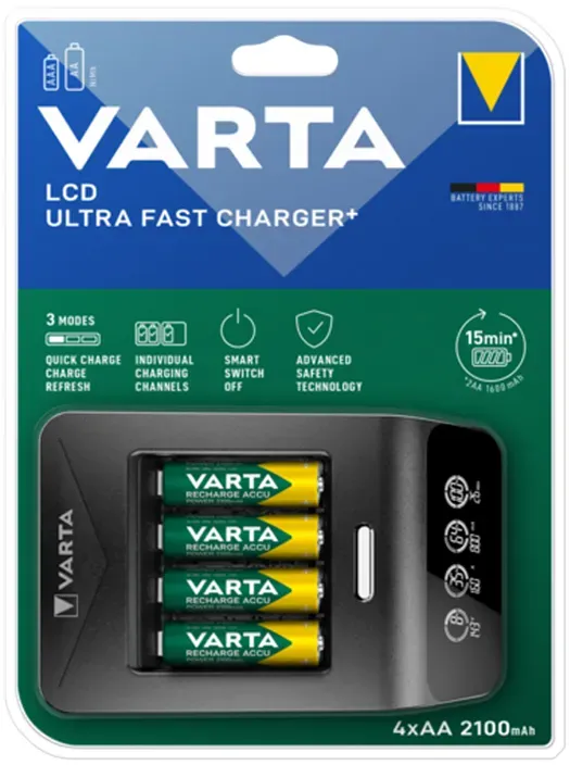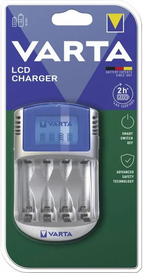 8 Händlerangebote bei billiger.de - Kategorie: Netzteile & Ladegeräte - Varta - Der VARTA Power on Demand LCD Plug Charger+ kann AA, AAA und 9V NiMH Akkus und ein USB gerät gleichzeitig laden. Verfügt über die Möglichkeit der vorteilhaften Einzelschachtladung, außerdem bricht der Ladeprozess automatisch ab, sobald die Akkus vollgeladen sind, um ein überladen zu vermeiden Das intuitive LCD Display zeigt den Ladevorgang in Prozent an. Umfassende Sicherheitsfunktionen für höchste Zuverlässigkeit: Kurzschlussschutz, Erkennung von schlechten und Alkaline Zellen, Minus Delta U Abschaltung und Schutz vor falscher Polarität. Lieferumfang: VARTA Power on Demand LCD Plug Charger+ inkl. 4x AA 2100mAh RECHARGRE ACCU Power on Demand in einer frust-freien Verpackung. - GTIN:4008496038336 Dieses Ladegerät ist mit 27.99 Euro ein gutes Mittelklasse-Angebot, das 4 AA/LR6 Mignon Power Akkus 2100 mAh enthält. ![]() ![]() Varta LCD Plug Charger inkl. 4 AA/LR6 Mignon Power Akkus 2100 mAh