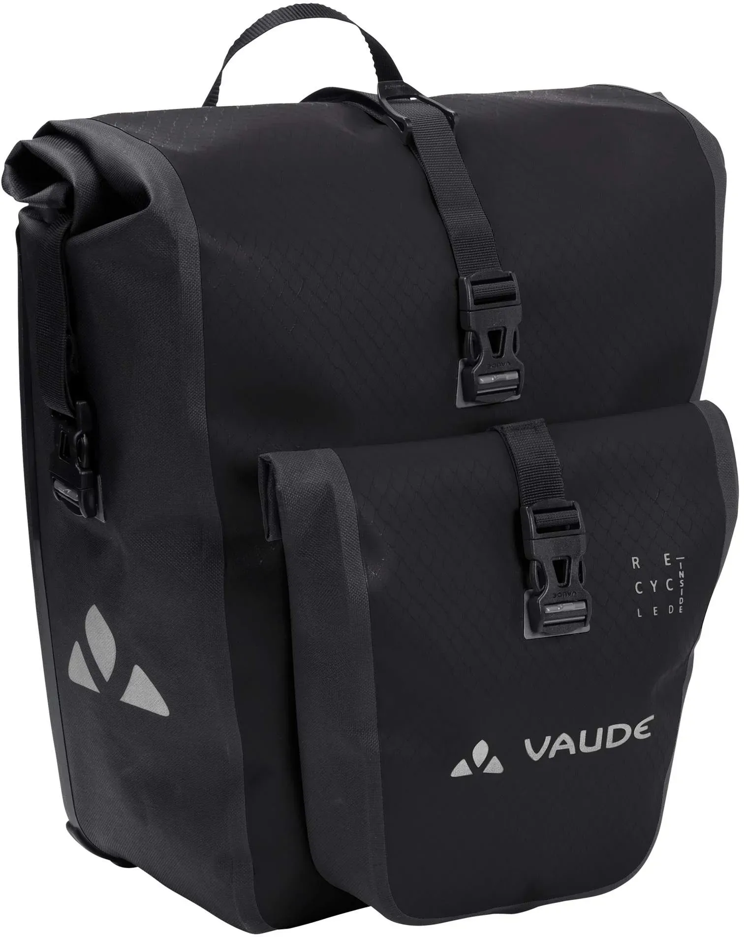 Kategorie: Fahrradtaschen - Vaude - GTIN:4052285991944 - Achtung, du erhältst hier 2 Taschen mit einem Volumen von jeweils 25,5 Litern! Auf in die große, weite Welt! Die wasserdichten Hinterradtaschen werden aus robustem, PVC-freiem Planenmaterial klimaneutral am deutschen Vaude-Standort in der Nähe des Bodensees hergestellt und würden gerne mit Dir auf große Reisen gehen. Sie lassen sich durch den Wickelverschluss auf individuelle Größen bringen und absolut dicht verschließen. Für übersichtlichkeit sorgen eine einfache Innentasche sowie die aufgeschweißte Außentasche. Die Radtaschen werden mit dem QMR 2.0-System und stabiler Rückenplatte rechts und links am hinteren Gepäckträger befestigt, sind über einfach bedienbare Handrädchen justierbar und lassen sich schnell und einfach abnehmen. Mit einem Fahrradschloss können sie direkt am QMR-Haken verriegelt werden. Reflexelemente sorgen für eine gute Sichtbarkeit im Straßenverkehr. - 137,00 Euro bei biwak.com - gefunden von billiger.de Ein recyceltes Modell in Schwarz, das eine umweltfreundliche Option für ein komplettes Set darstellt. ![]() ![]() Vaude Aqua Back Plus (rec) - Black One Size