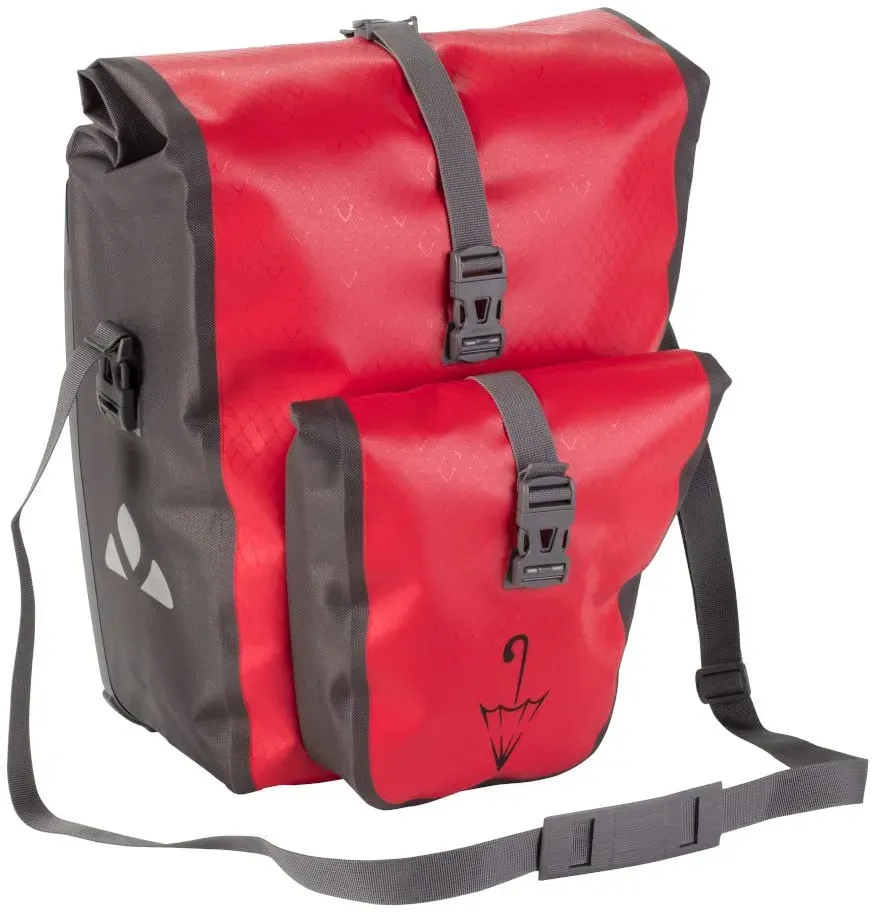 Kategorie: Fahrradtaschen - Vaude - GTIN:4062218621695 - Auf in die große, weite Welt! Die wasserdichten Hinterradtaschen werden aus robustem, PVC-freiem Planenmaterial klimaneutral am deutschen VAUDE-Standort in der Nähe des Bodensees hergestellt und würden gerne mit Dir auf große Reisen gehen. Sie lassen sich durch den Wickelverschluss auf individuelle Größen bringen und absolut dicht verschließen. Für übersichtlichkeit sorgen eine einfache Innentasche sowie die aufgeschweißte Außentasche. Die Radtaschen werden mit dem QMR 2.0-System und stabiler Rückenplatte rechts oder links am hinteren Gepäckträger befestigt, sind über einfach bedienbare Handrädchen justierbar und lassen sich schnell und einfach abnehmen. Mit einem Fahrradschloss können sie direkt am QMR-Haken verriegelt werden. Reflexelemente sorgen für eine gute Sichtbarkeit im Straßenverkehr. Gewicht ca.: 1060 g (Einzeltasche), 2120 g (Paar) Volumen: 25,5 Liter (Einzeltasche), 51,0 Liter (Paar) Maße: 44 x 33 x 31 cm - 64,99 Euro bei Amazon Marketplace Luggage - gefunden von billiger.de Ein weiteres attraktives Sondermodell für eine einzelne Tasche zu einem sehr guten Preis. ![]() ![]() VAUDE Aqua Back Plus Single Sondermodell mit Schirmlogo Hinterradtasche Gepäckträgertasche, Red SE