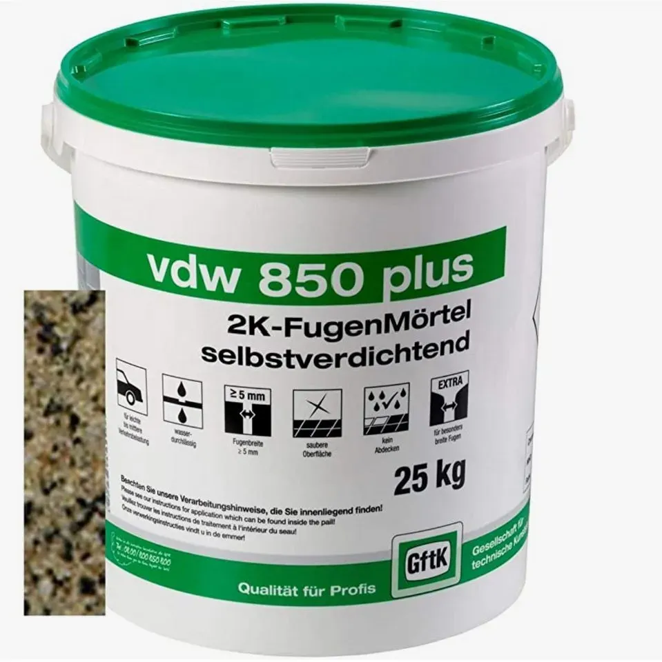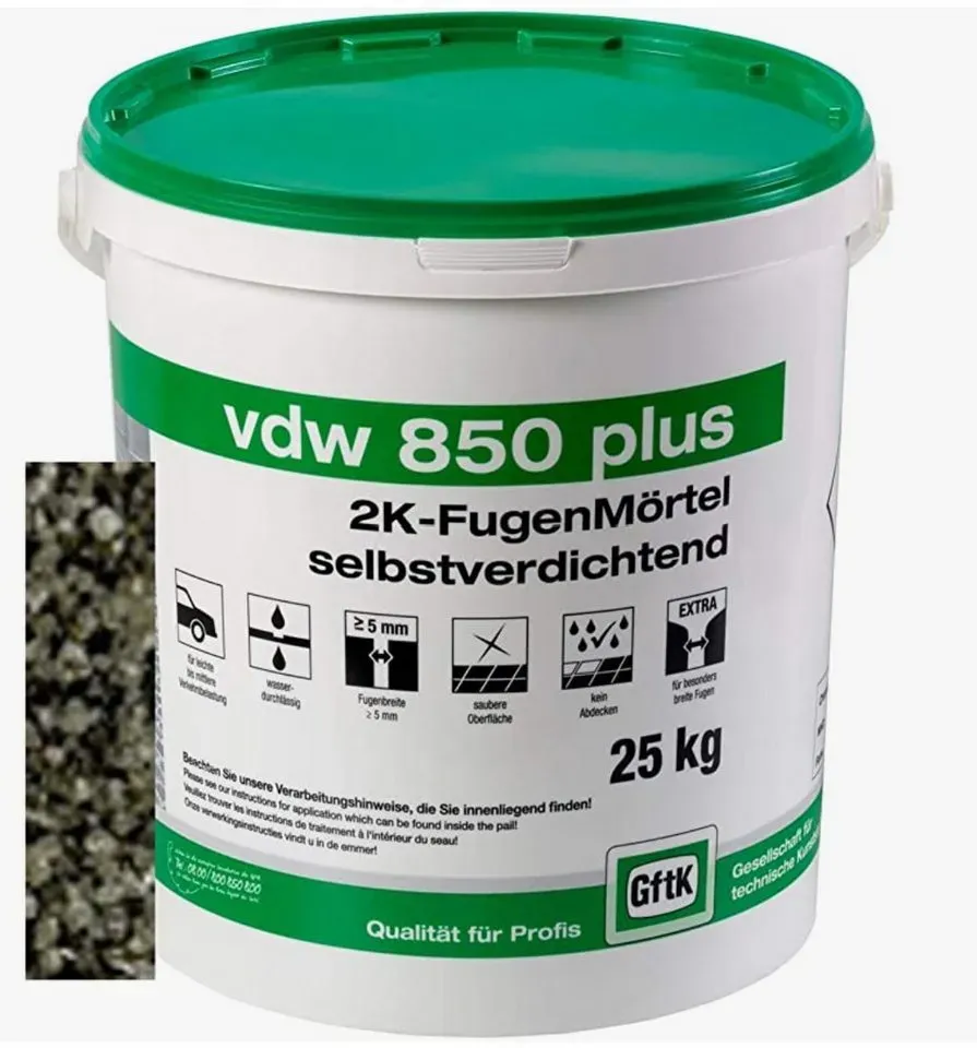 5 Händlerangebote bei billiger.de - Kategorie: Baumaterial - GftK - vdw 850 plus 2K-Fugenmörtel 25kg selbstverdichtend Reaktionsharzgebundener Pflasterfugenmörtel mit abgestufter Mineralkornmischung Der vdw 850 plus 2K-Fugenmörtel ist die ideale Lösung für die Verfugung von Natursteinpflaster, Betonsteinpflaster und Klinkerbelägen in Bereichen mit leichter bis mittl - GTIN:4049617853032 ![]() ![]() GftK vdw 850 plus 2K-Fugenmörtel 25kg selbstverdichtend - 25 kg