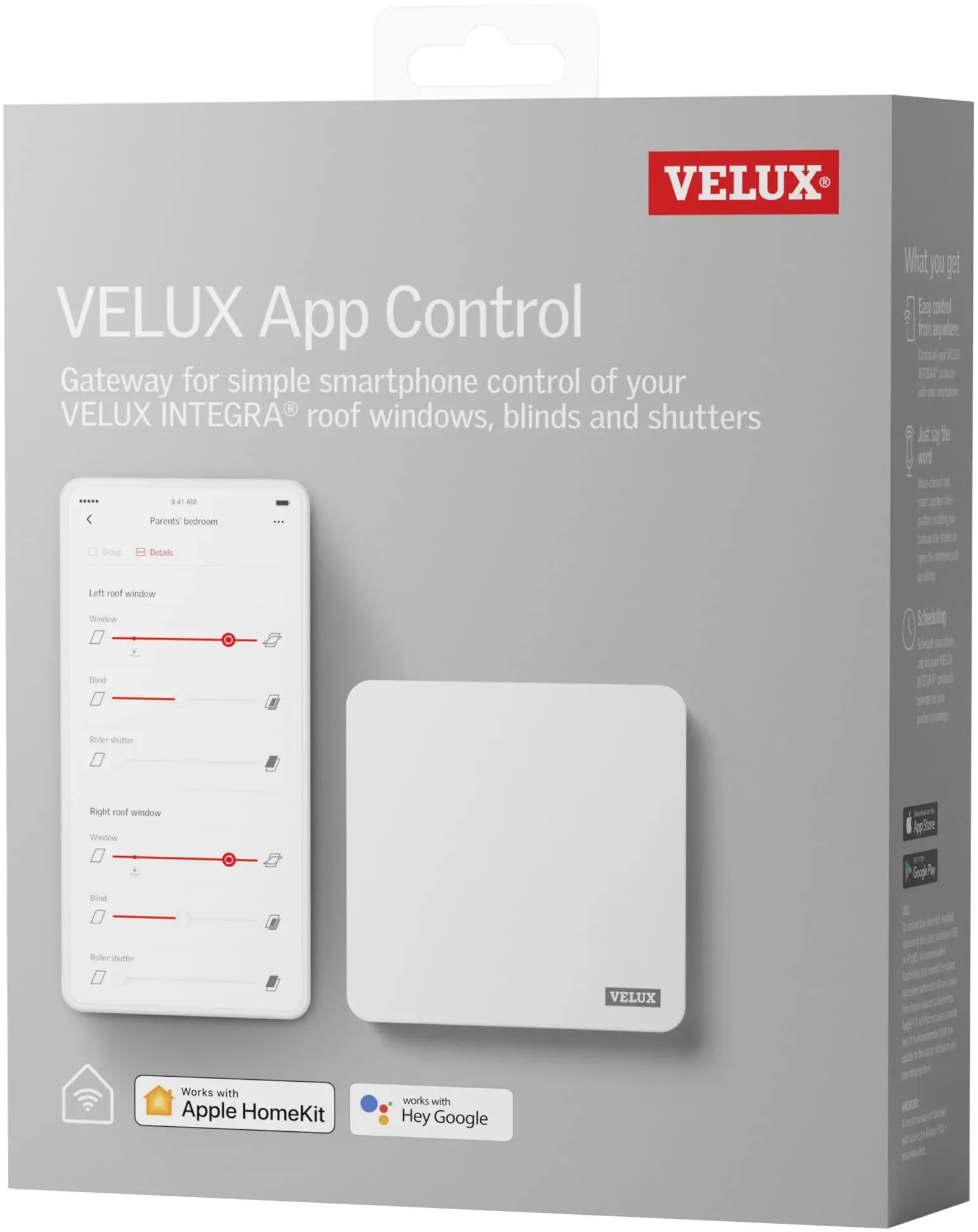 3 Händlerangebote bei billiger.de - Kategorie: Zubehör für Fenster - VELUX - Bequeme Bedienung aller VELUX INTEGRA? Produkte per Smartphone oder per Sprachsteuerung durch Kompatibilität zu dem Sprachassistenten Google Assistant oder Apple Home-Kit?. Das VELUX App Control enthält ein Internet Gateway. Es können alle VELUX INTEGRA? Produkte mit dem Funkprotokoll io-homecontrol angesteuert werden (außer KRA und KRD). Lieferzeit nur 2 Tage - GTIN:5702329268530 ![]() ![]() VELUX App Control für elektrisch und solarbetriebene Dachfenster, Rollos und Rollläden (KIG 300)