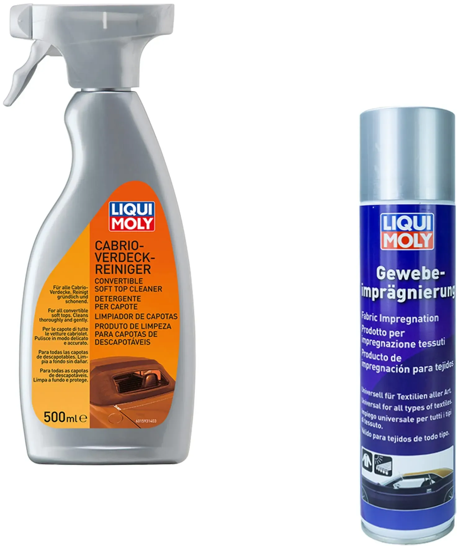 Kategorie: Autoreinigung & Pflege - Sonax - GTIN:4055543702597 - 1x 500ml SONAX CABRIOVERDECKREINIGER VERDECKREINIGER+ SONAX MULTISCHWAMM SCHWAMM - 20,99 Euro bei Amazon Marketplace Health & Personal Care - gefunden von billiger.de Dieses LIQUI MOLY Set bietet eine Kombination aus Verdeckreiniger und Gewebeimprägnierung für eine komplette Pflege. ![]() ![]() LIQUI MOLY Cabrio-Verdeckreiniger Textil Reiniger Cabrio 500 ml 1593 + Gewebe Im