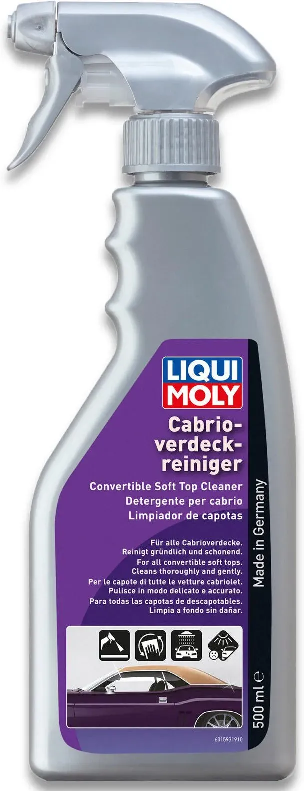 3 Händlerangebote bei billiger.de - Kategorie: Autoreinigung & Pflege - LIQUI MOLY - Reinigt schnell, gründlich und schonend meist vorkommende Verschmutzungen wie öl- und Fettrückstände, Ruß, Vogelkot, Insektenrückstände, Straßenschmutz etc. von Cabrio-Verdecken. Greift Kunststoffe aus Polycarbonat und Heckscheibenaus PVC auch bei häufiger Anwendung nicht an. Durch die antistatischen Komponenten wird die elektrostatische Anziehung der Schmutzteilchen vermindert, die Haftung reduziert und das Ablösen erleichtert. Cabrio-Verdeckreiniger am besten während der Wagenwäsche anwenden. - GTIN:4100420015939 Dieser LIQUI MOLY Cabrioverdeckreiniger ist ein vielseitiges Produkt, das effektiv gegen verschiedene Verschmutzungen wirkt und für Stoff- und Kunststoffverdecke geeignet ist. ![]() ![]() LIQUI MOLY Cabrioverdeckreiniger, Art.-Nr. 1593 I 500ml Cabrio Verdeck-Reiniger gegen Verwitterung I Entfernt Öl- & Fettflecken, Ruß, Vogelkot, Insekten & Schmutz I Für Verdecke aus Stoff & Kunststoff