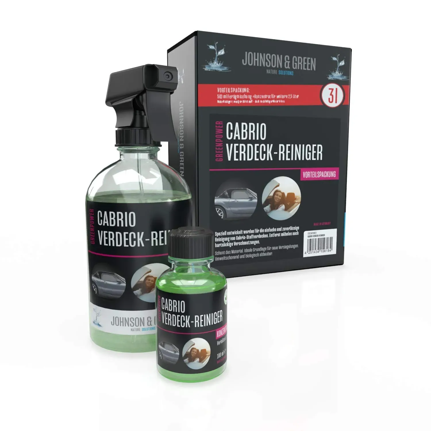Kategorie: Reinigungsmittel - Johnson & Green Nature Solutions - GTIN:4251434156184 - inkl. Konzentrat für bis zu 3 Liter Greenpower Cabrio-Verdeckreiniger entfernt mühelos auch hartnäckige Verschmutzungen Umweltschonend und biologisch abbaubar für den privaten und professionellen Gebrauch geeignet Lieferumfang: 1x 500ml Reiniger + 1x 100ml Konzentrat zum Wiederbefüllen (für insgesamt bis zu 3 Liter Reiniger) - 19,90 Euro bei Amazon Marketplace Automotive - gefunden von billiger.de Dieses SONAX Set kombiniert den Verdeckreiniger mit einem Multischwamm für eine umfassende Reinigung. ![]() ![]() 1x 500ml SONAX CABRIOVERDECKREINIGER VERDECKREINIGER+ SONAX MULTISCHWAMM SCHWAMM