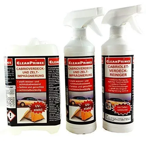 Kategorie: Autoreinigung & Pflege - Cleanprince - GTIN:4260355037366 - einfache Reinigung von Textilverdecken entfernt Flecken und Verschmutzungen greift die Originalimprägnierung nicht an - 32,90 Euro bei Amazon Marketplace Health & Personal Care - gefunden von billiger.de Das CleanPrince Cabriolet Set ist eine umfassende Lösung, die Verdeckreiniger und eine große Menge Imprägnierung enthält. ![]() ![]() CleanPrince Cabriolet Set CP600240 Reinigung und Imprägnierung | enthält 0,5 L Verdeckreiniger sowie 2,5 L Cabrioverdeck- und Zelt-Imprägnierung