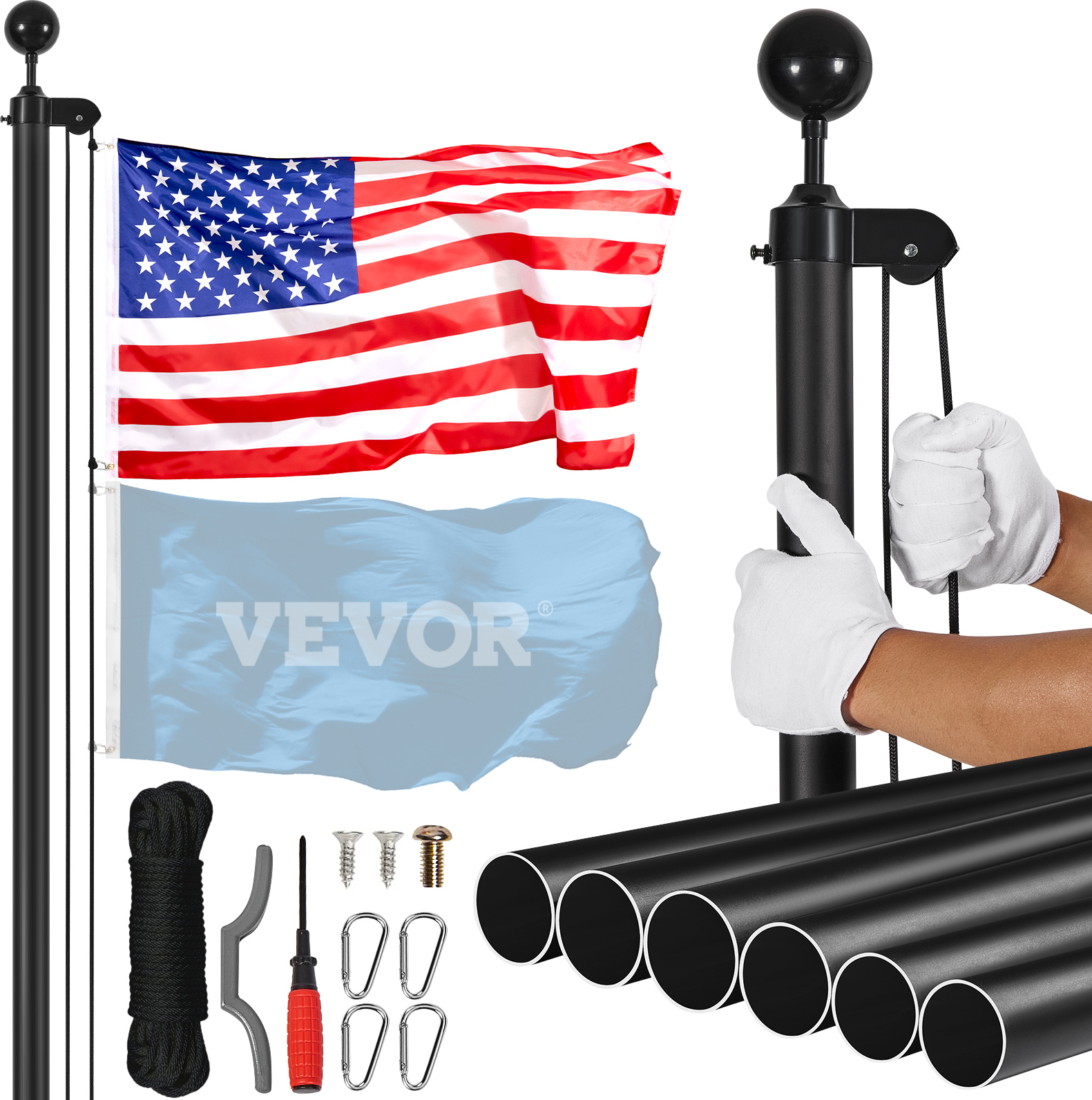 Auf Lager Versand durch AmazonVEVOR Abnehmbarer Fahnenmast-Bausatz, 9 m, Robustes Fahnenstange-Bausatz aus Aluminiumlegierung im Boden für den Außenbereich, Fahnenmast mit 3 Anzeigemodi und professionellem Zubehör, schwarz