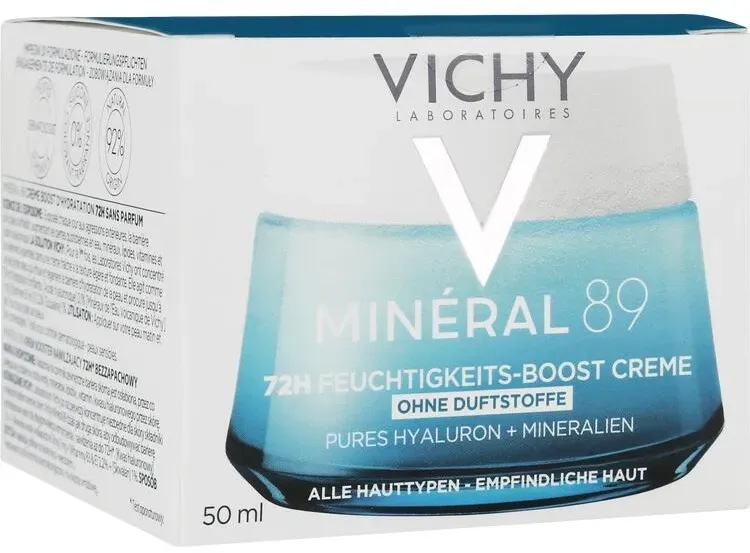25 Händlerangebote bei billiger.de - Kategorie: Arzneimittel - Vichy - Anwendungsgebiet von Vichy Mineral 89 Creme Ohne DuftstoffeVichy Mineral 89 Creme Ohne Duftstoffe spendet der Haut dank dem innovativen Wirkstoffkomplex bis zu 72 Stunden lang intensive Feuchtigkeit und sorgt für somit für einen natürlichen Glow.Wirkungsweise von Vichy Mineral 89 Creme Ohne DuftstoffeErleben Sie Feuchtigkeit für Ihre Haut, wie Sie sie noch nie erlebt haben: Vichy Mineral 89 Creme Ohne Duftstoffe ist eine optimale Ergänzung zum beliebten MIN RAL 89 Hyaluron-Booster. Der innovative Wirkstoffkomplex aus langkettiger Hyaluronsäure und Squalan, Mineralien sowie Niacinamid (B3) und Vitamin E sorgt für einen sofortigen Feuchtigkeits-Boost. Die Ceramid-Produktion wird in der Tiefe der Haut angeregt und die Hautschutzbarriere gestärkt. Vichy Mineral 89 Creme Ohne Duftstoffe setzt dabei auf eine minimalistische Formel, die ohne Duftstoffe, Alkohol und Silikone auskommt. So eignet sich die feuchtigkeitsspendende Gesichtscreme insbesondere für empfindliche Haut.Wirkstoffe / Inhaltsstoffe / ZutatenVichy Mineral 89 Creme Ohne Duftstoffe enthält: Aqua / Water Glycerin Dicaprylyl Ether Pentylene Glycol Polyglyceryl-6 Distearate Niacinamide Propanediol Cetyl Esters Jojoba Esters Cetearyl Isononanoate Squalane Behenyl Alcohol Adenosine Capryloyl Salicylic Acid Hydroxyacetophenone Mineral Salts Sodium Hyaluronate Trisodium Ethylenediamine Disuccinate Vitreoscilla Ferment Tocopherol Acacia Decurrens Flower ... Dieses Produkt bietet eine Kombination aus 72h Feuchtigkeit, UV-Schutz LSF 50+ und hautpflegenden Inhaltsstoffen wie Hyaluron, Vitamin B3 und Squalan. ![]() ![]() Vichy Minéral 89, 72h Feuchtigkeits-Boost und UV-Fluid mit LSF 50+, Sonnenschutz- und Hyaluron-Creme, Mit Vitamin B3 und Squalan, Für intensive Feuchtigkeit und strahlende Haut, 50 ml