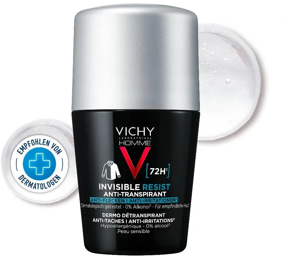 225.00 / 1 Liter - Kategorie: Deodorants - Vichy - GTIN:3337875894234 - PZN:19073467 - Der Vichy Homme Deo Roll-on 72h Anti-Flecken Invisible reguliert bis zu 72 Stunden lang extreme Schweißbildung und hinterlässt dank seiner Anti-Flecken-Formel keine gelblichen oder weißen Rückstände auf Textilien. Der Wirkstoffkomplex stärkt die Hautschutzbarriere und ist besonders für empfindliche Männerhaut geeignet. Anwendungshinweis: Das Vichy Homme Deo Roll-on 72h AF Invisible täglich auf die gereinigte Haut der Achseln auftragen. Am besten das Deo für Männer direkt nach dem Duschen auftragen - bevor die Kleidung angezogen wird. Die Anti-Flecken- und Anti-Transpirant-Formel hält bis zu 72 Stunden an, kann aber je nach Bedarf zwischendurch aufgefrischt werden. Inhaltsstoffe: Value1: AQUA / WATER / EAU ? ALUMINUM CHLOROHYDRATE ? DIMETHICONE ? C14-22 ALCOHOLS ? PARFUM / FRAGRANCE ? STEARETH-100/PEG-136/HDI COPOLYMER ? PERLITE ? TETRASODIUM GLUTAMATE DIACETATE ? C12-20 ALKYL GLUCOSIDE ? PENTYLENE GLYCOL - 11,25 Euro bei Sanicare Apotheke - gefunden von billiger.de Ein weiteres gutes Angebot für ein einzelnes 50ml Vichy Stress Resist Deo. ![]() ![]() VICHY DEO Stress Resist 72h 50 ml Creme