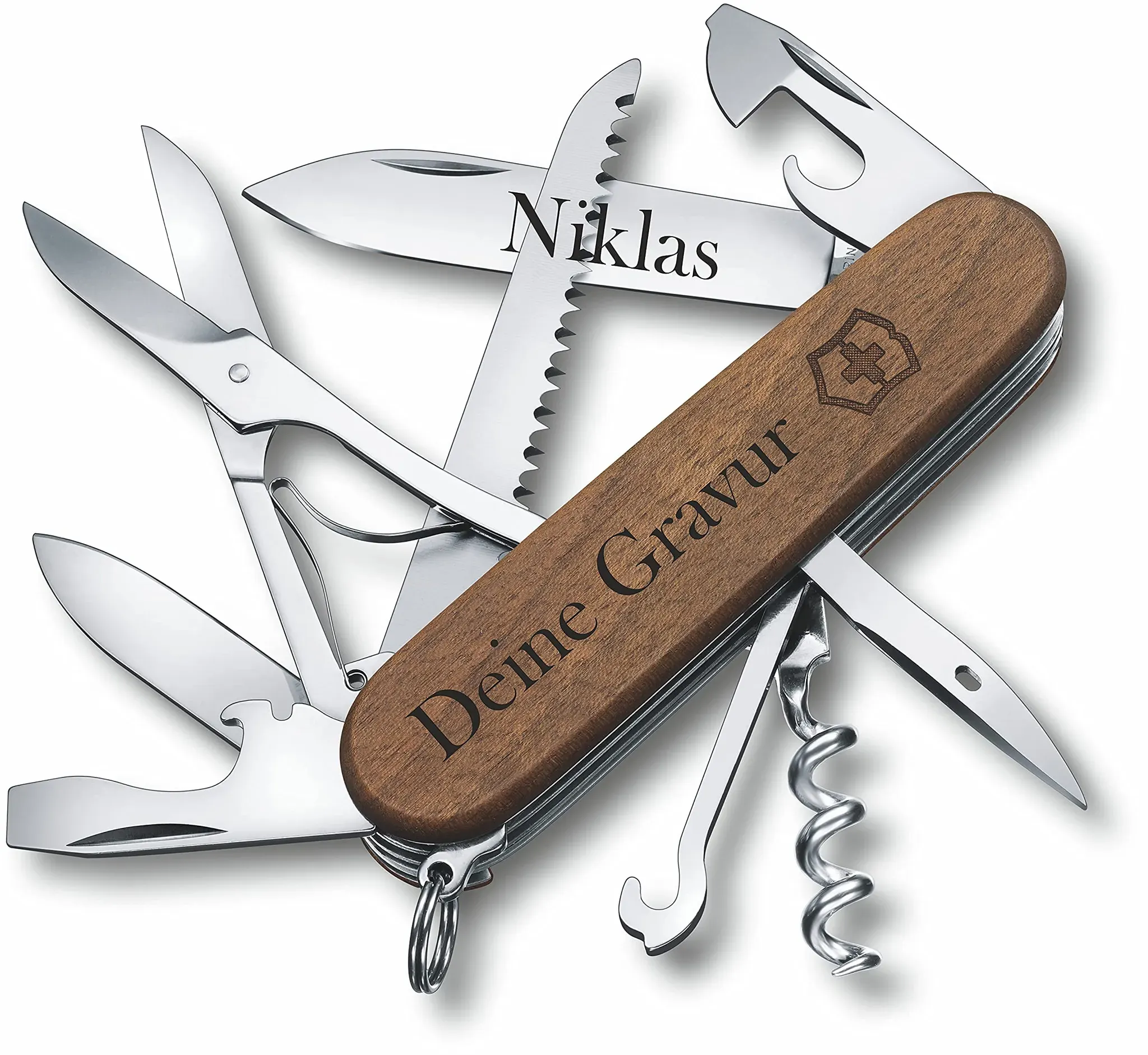 Kategorie: Taschenmesser - Victorinox - GTIN:7611160106308 - 15 FUNKTIONEN: Große Klinge, kleine Klinge, Dosenöffner, Schraubendreher 3/6 mm, Kapselheber, Drahtabisolierer, Stech-Bohr-Nähahle, Korkenzieher, Schere, Holzsäge, Mehrzweckhaken, Zahnstocher, Pinzette, Schlüsselanhänger EXKLUSIV & FUNKTIONAL: Das limitierte Taschenmesser begeistert durch sein praktisches Design und seine vielen Funktionen. Es liegt gut in der Hand und ist mit seinen verschiedenen Funktionen ein echter Allrounder. VIELSEITIG & HOCHWERTIG: Egal ob beim Camping, Outdoor-Trip, Survival-Training, unterwegs auf Reisen oder im Alltag - das Taschenwerkzeug in kompakter Größe ist der ideale Begleiter. Hergestellt in der Schweiz überzeugt es durch höchste Qualität. LIEFERUMFANG & ABMESSUNGEN: 1 Huntsman, Abmessungen: 91 x 26 x 21 mm, Gewicht: 97 g, Schalenmaterial: ABS/Cellidor, Farbe: Schwarz, Artikelnummer: 1.3713.3B1 HöCHSTE QUALITäT AUS DER SCHWEIZ: Victorinox ist Hersteller von Schweizer Taschenmessern, Haushalts- und Berufsmessern, Uhren und Reisegepäck. Die über 140-jährige Geschichte des Schweizer Familienunternehmens ist geprägt von Tradition, Qualität und Innnovation. - 45,00 Euro bei Amazon Marketplace Sports - gefunden von billiger.de Dieses Huntsman Wood mit Gravurmöglichkeit am Griff ist ein ideales personalisiertes Geschenk. ![]() ![]() Victorinox Taschenmesser Huntsman Wood aus Holz mit Gravur I Geschenk für Männer Frauen I zum Geburtstag I Schweizer Taschenmesser personalisiert Griff Klinge (Gravur am Griff)