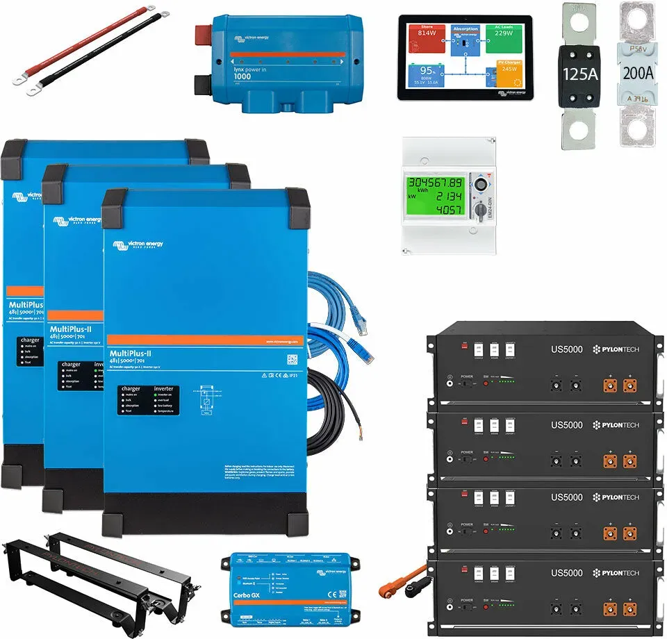 Kategorie: Stromspeicher - husatech - HUSATECH PowerSet 3 Phasig mit Victron Energy Multiplus II 48/5000/70-50 GX und 19,2kWh Pylontech US5000 Speicher Das Heimspeicher-Set für Haushalte (2-6 Personen) mit einem größeren Jahresstromverbrauch (mehr als 5500 kWh). Der Victron Energy MultiPlus II Wechselrichter ist das intelligente Gerät, welches eine zentrale Rolle im Stromnetz bei Dir zuhause spielt. Er wandelt den von Deiner Solaranlage erzeugten Gleichstrom in nutzbaren Wechselstrom für den Betrieb Deines Haushaltes um. Darüber hinaus kann er auch als Ladegerät für den Batteriespeicher dienen und bei Bedarf als unterbrechungsfreie Stromversorgung (USV) fungieren. So ist sichergestellt, dass Deine wichtigen Gerätschaften wie Sauerstoffgerät oder Kühlschrank auch bei einem Stromausfall weiterhin mit Energie versorgt werden! Der MultiPlus II ist so konzipiert, dass er je nach den Bedürfnissen automatisch zwischen den verschiedenen Funktionen wechseln kann, um eine zuverlässige Stromversorgung zu gewährleisten. Er lässt sich mit einem MPPT-Solar-Ladegerät oder einem Netz-Einspeise-Wechselrichter für PV-Anlagen kombinieren. Erzeugt die PV-Anlage mehr Energie als Du gerade verbrauchst, wird der überschüssige Strom in den Akku geleitet. Sobald die Sonnenverhältnisse nachlassen, wird nicht genügend Energie produziert, um den Eigenbedarf zu decken. Erst dann wird die gespeicherte Energie wieder aus dem Akku entnommen. Ein Energiemanager sorgt dafür, dass der Stromfluss optimal ... Dieses HUSATECH PowerSet ist ein 3-phasiges System mit 19,2 kWh Pylontech US5000 Speicher und eignet sich für größere Anlagen mit höherem Energiebedarf. ![]() ![]() HUSATECH PowerSet 3 Phasig mit Victron MultiPlus-II 48/5000/70-50 und 19,2 kWh Pylontech US5000 Speicher