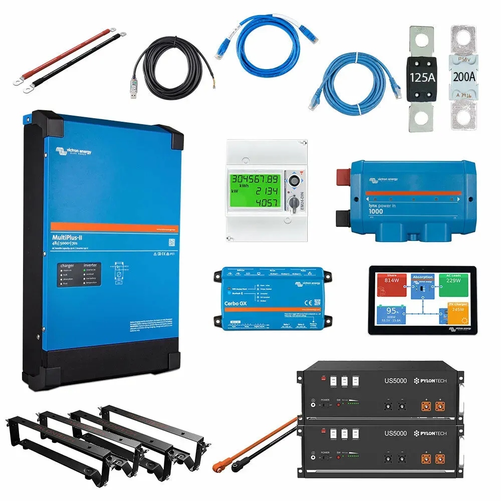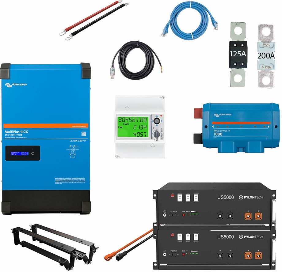 Victron Energy - EAN: 8719076047599 - Ein MultiPlus, plus ESS (Energy Storage System) Funktion Das MultiPlus-II ist ein multifunktionales Wechselrichter-/Ladegerät mit allen Funktionen des MultiPlus und einer zusätzlichen Funktion, nämlich die eines externen Stromsensors. Dadurch werden die Funktionen PowerControl und PowerAssist auf 50 A bzw. 100 A erweitert. Das MultiPlus-II eignet sich bestens für die professionelle Seefahrt, Yachten, Fahrzeuge und landgebundene, netzferne Anwendungen. Das Gerät verfügt außerdem über eine eingebaute Anti-Islanding-Funktion und erhält in immer mehr Ländern die Zulassung für eine ESS-Anwendung. Es sind mehrere verschiedene Systemkonfigurationen möglich. Weitere Informationen finden Sie im Handbuch ESS Design & Konfiguration. PowerControl und PowerAssist - Steigerung von Netz- oder Generator- Leistung Es kann ein maximaler Netz- oder Generatorstrom eingestellt werden. Das MultiPlus-II nimmt dann Rücksicht auf weitere angeschlossene Wechselstromverbraucher und nutzt zum Laden der Batterie nur den Strom, der noch 'übrig' ist. So wird verhindert, dass der Generatoroder der Netzanschluss überlastet wird (PowerControl-Funktion). Mit der Funktion PowerAssist erhält das PowerControl-Prinzip eine neue Dimension. Lastspitzen treten häufig nur für einen begrenzten Zeitraum auf. In einem solchen Fall kompensiert das MultiPlus-II zu schwache Generator-, Landstrom- bzw. Netzleistung sofort durch Energie aus der Batterie. Wird die Last reduzie - bei ... Dieses HUSATECH PowerSet ist die GX-Version des 1-phasigen Systems mit 9,6 kWh Pylontech US5000 Speicher und bietet erweiterte Überwachungsfunktionen. ![]() ![]() HUSATECH PowerSet 1 Phasig mit Victron MultiPlus-II 48/5000/70-50 GX und 9,6 kWh Pylontech US5000 Speicher